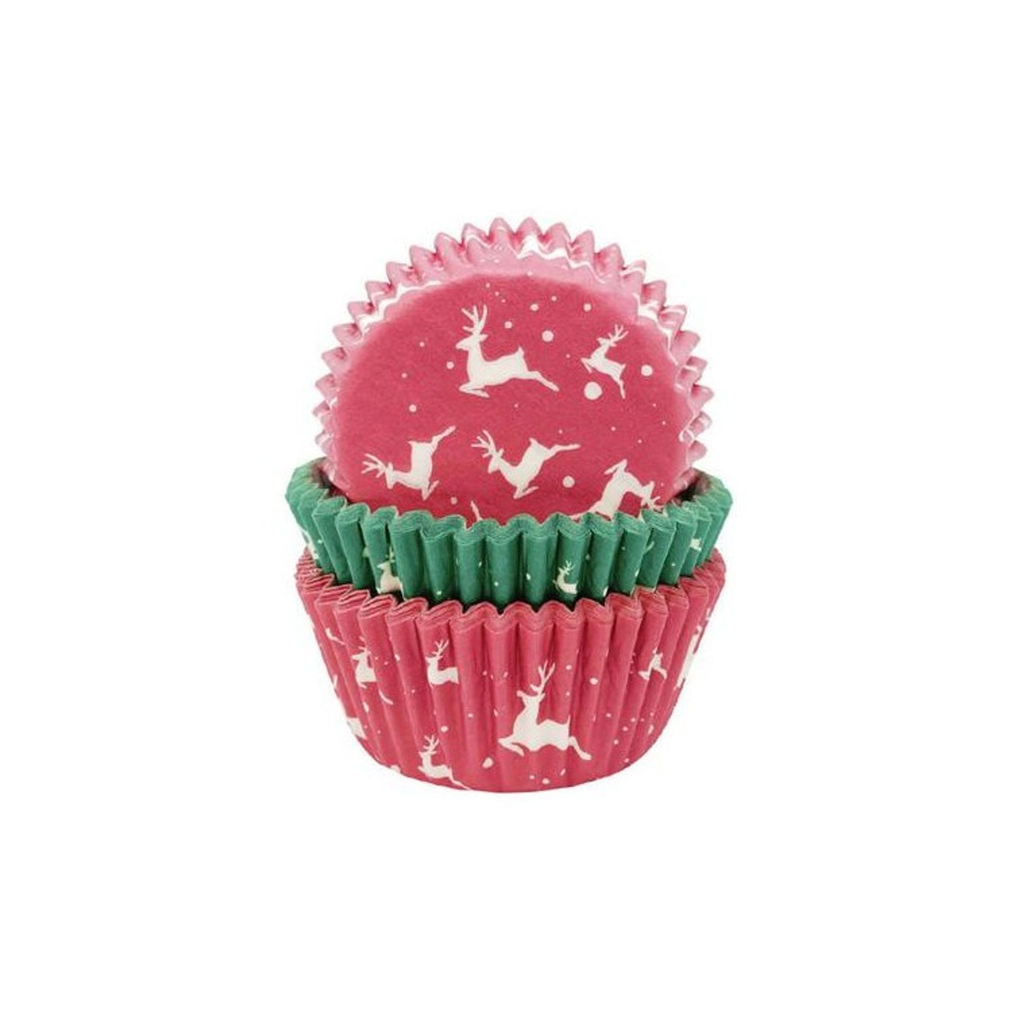 Underbara muffinsformar i rött och grönt med motiv av vita renar. Dessa formar är perfekta att använda när julens godsaker ska bakas.