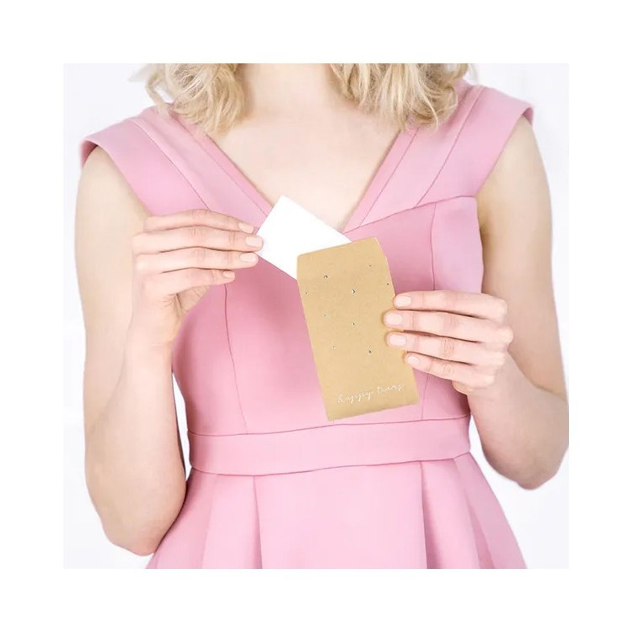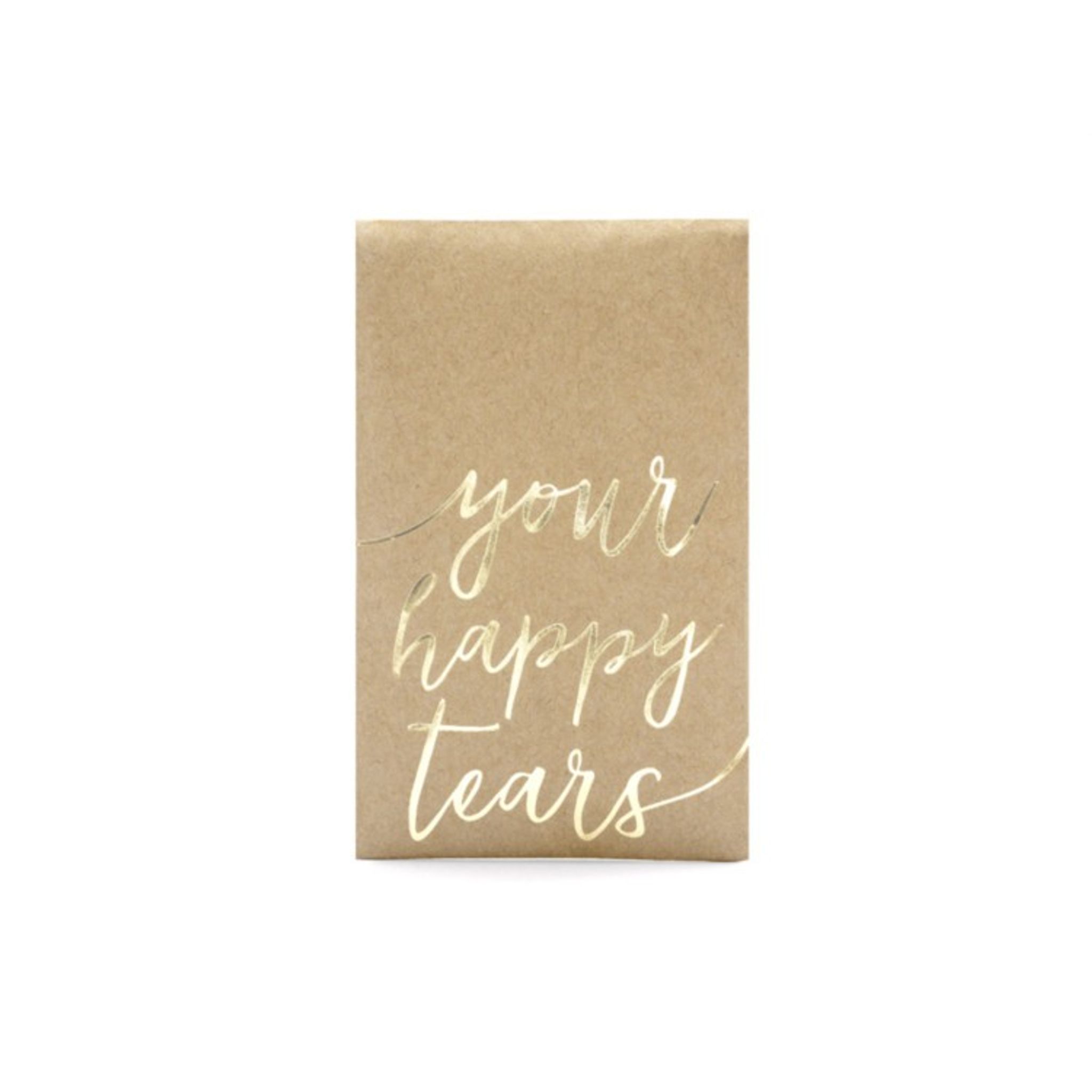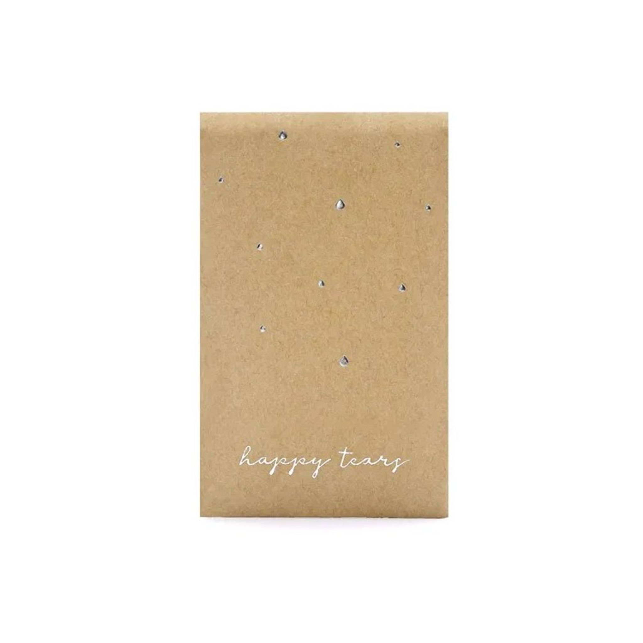 10 st förpackningar i naturkartong med fin text "Your Happy Tears" (bokstäverna är i silver) och små droppformade dekorationer (även dessa i silver). Varje förpackning innehåller 3 st näsdukar.