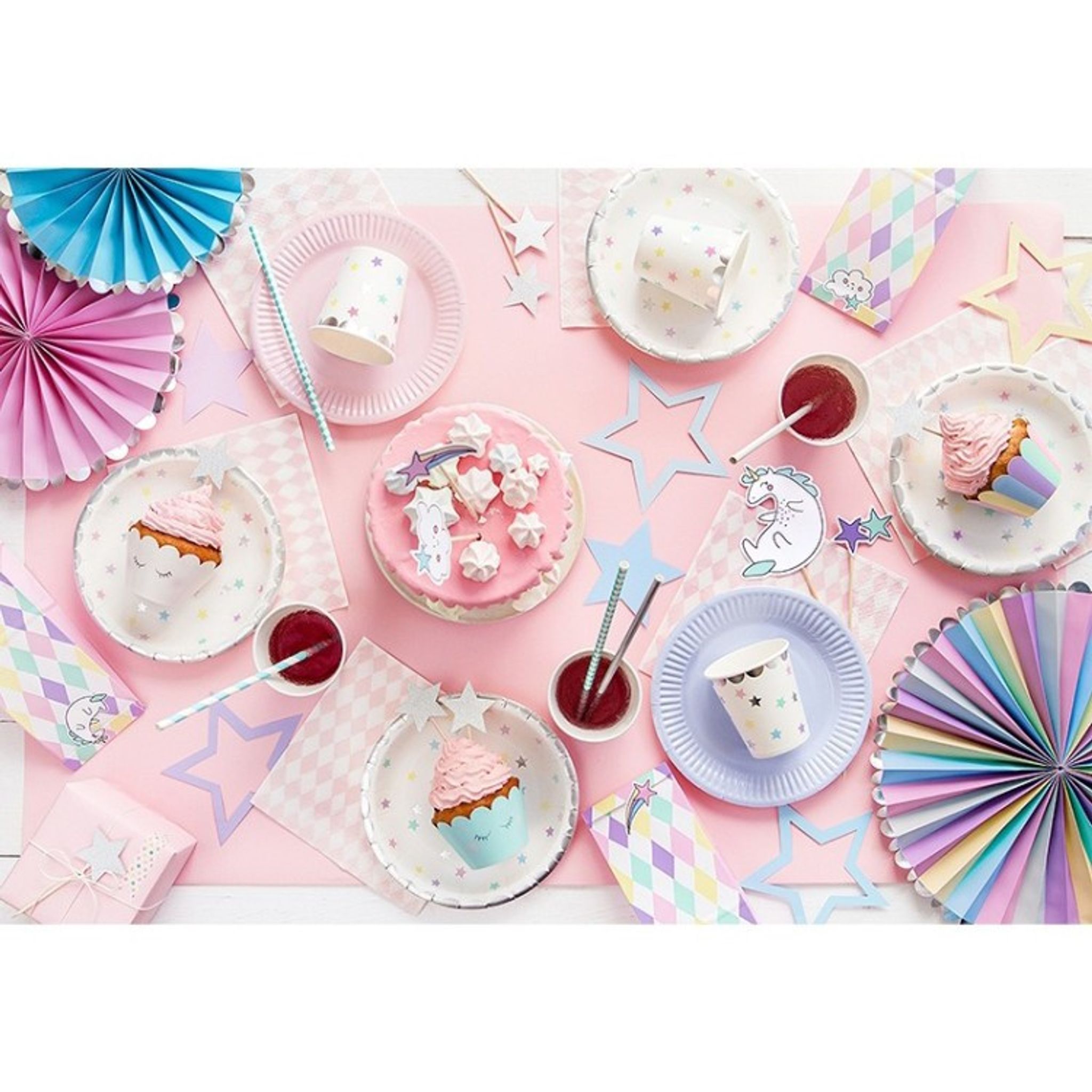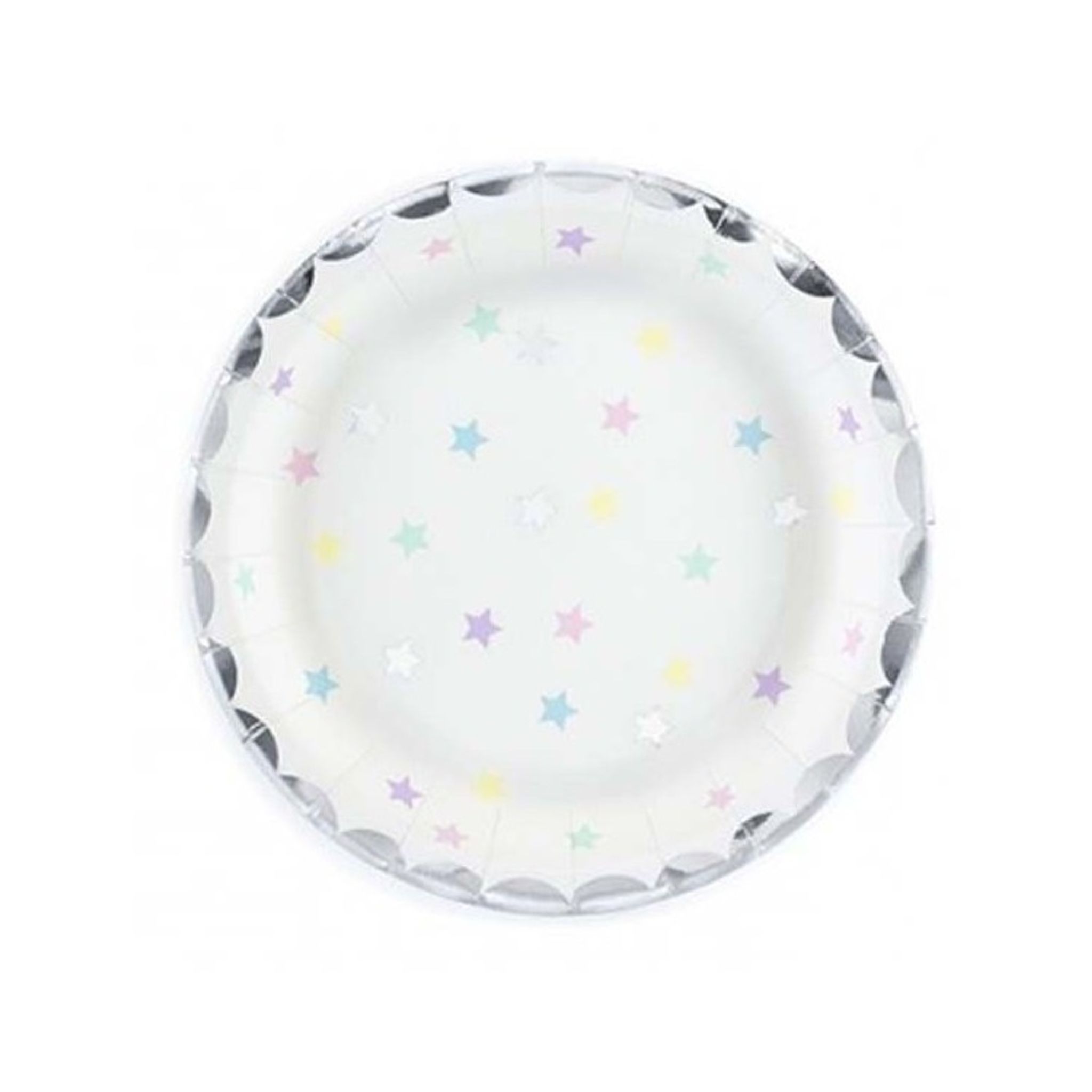 Stilrena papptallrikar i vitt med små, pastellfärgade stjärnor – en lekfull men elegant detalj till kalas, babyshowers eller andra festliga tillfällen. Tallrikarna har en diameter på ca 18 cm och passar perfekt för tårta, fika eller små rätter. Komplettera gärna med matchande pappersmuggar och andra produkter i serien för en enhetlig dukning!