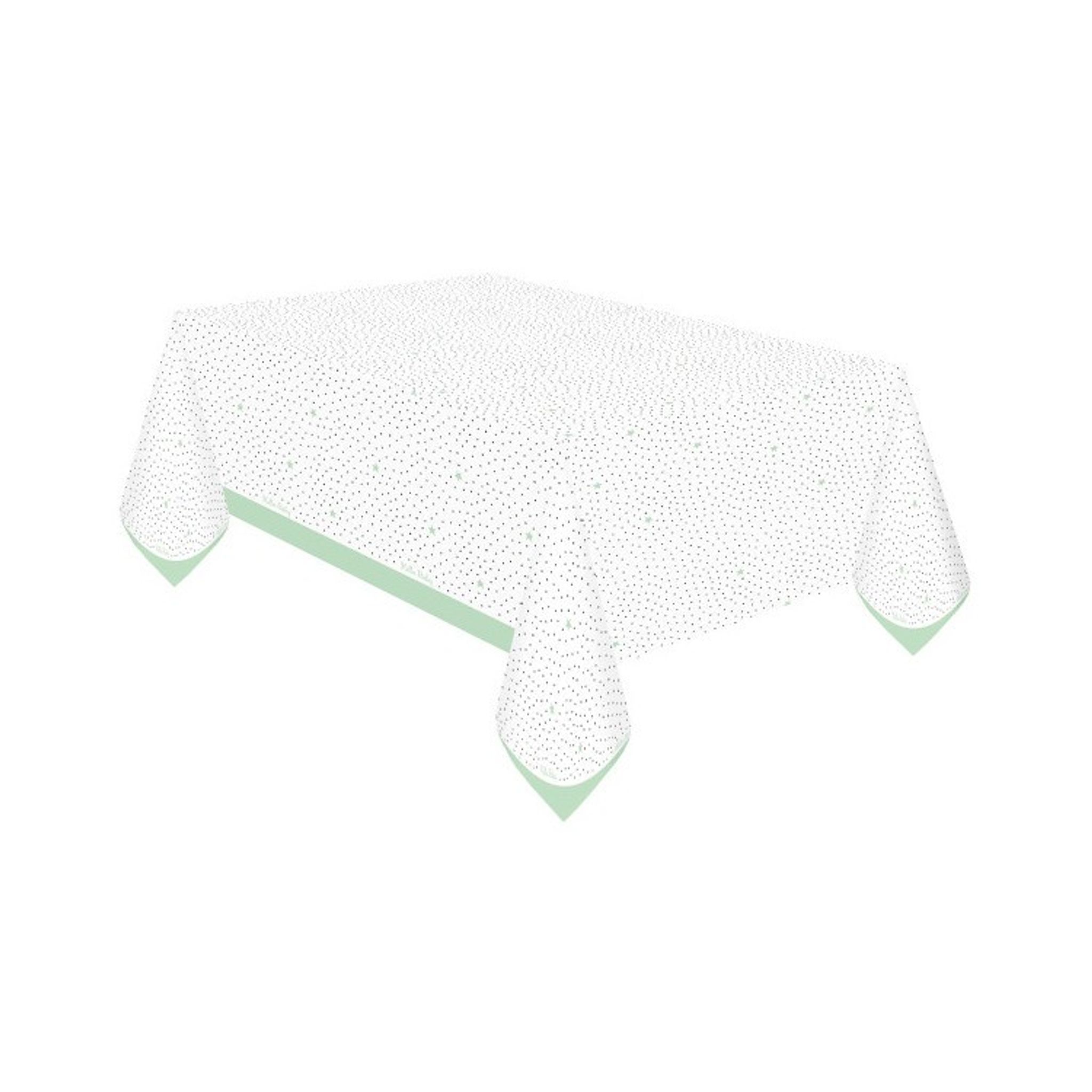 Papappersduken är vit i grunden med svarta små prickar, mintgröna stjärnor, mintgrön rand längs med nedre kanten samt passande texten "Hello baby".