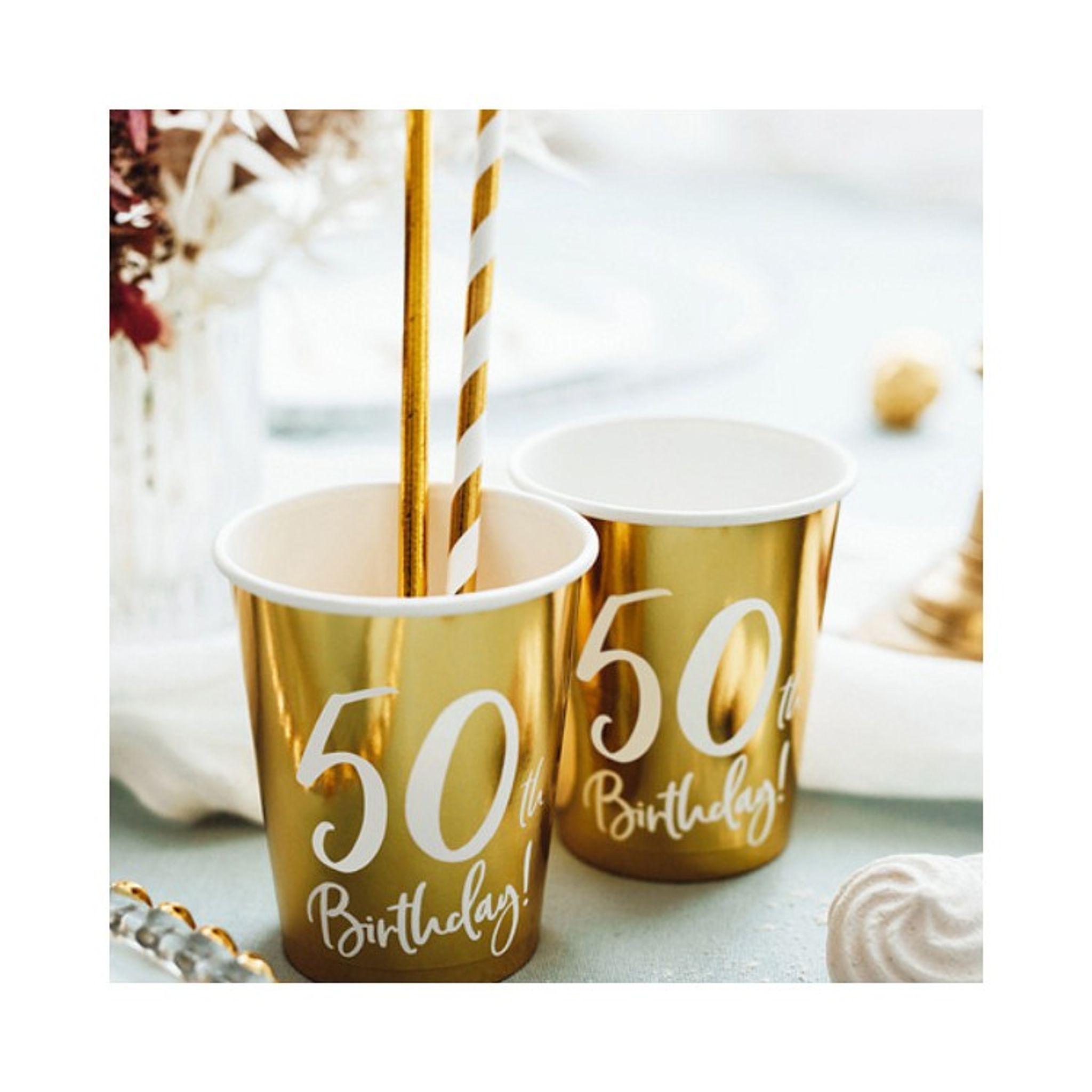 Pappersmuggar i guld med snyggt motiv för dig sm fyller 50 år. Mixa och matcha med övriga produkter för att skapa en läcker dukning på 50års-festen! Antal: 6 st Storlek: 220 ml, höjd ca 9 cm