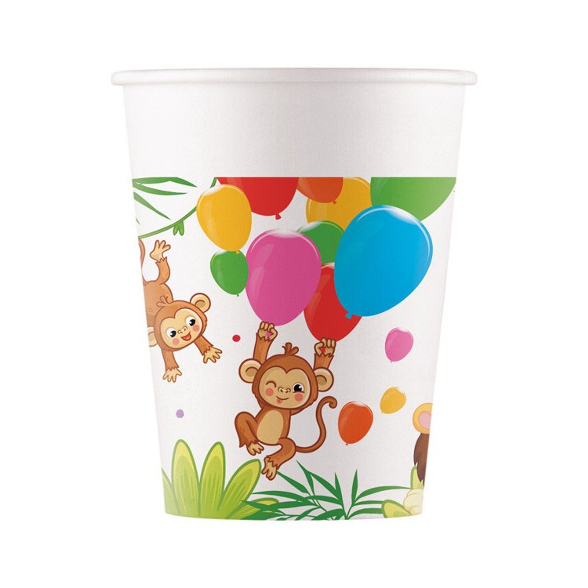 Dessa festliga pappersmuggar är perfekta till barnkalasets dukning. Härliga att servera saft till de små gästerna och kaffe till de vuxna ur. Festliga pappersmuggar med ett gäng glada djungeldjur med kalashattar och färgglada ballonger på.