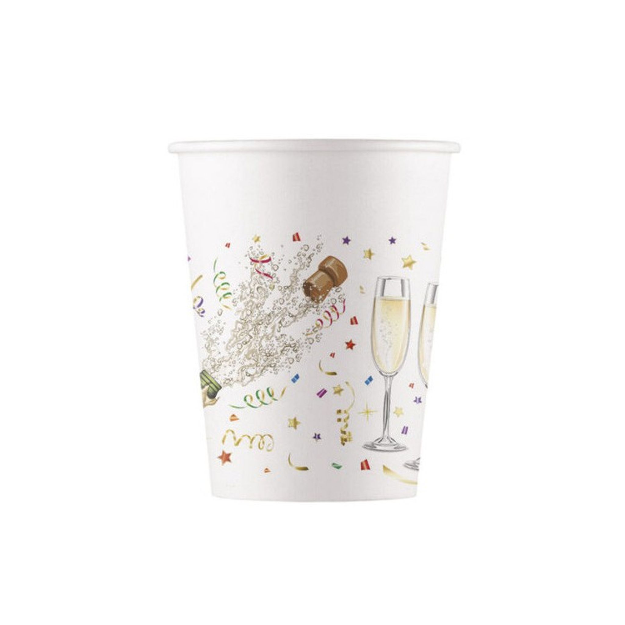 Pappersmuggar Fest. Här har du riktigt festliga pappersmuggar till både fest och kalas. Unna dina gäster några snygga pappersmuggar med vacker design som höjer nivån på din dekoration till skyarna. Med motiv av en sprutande champagneflaska samt serpentiner och konfetti sätter det stämningen på din fest.