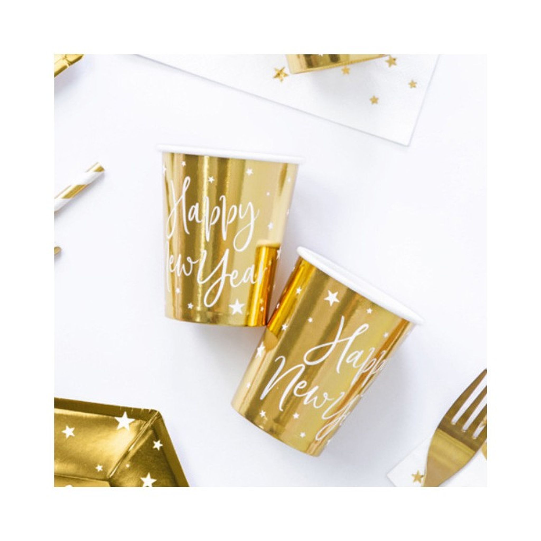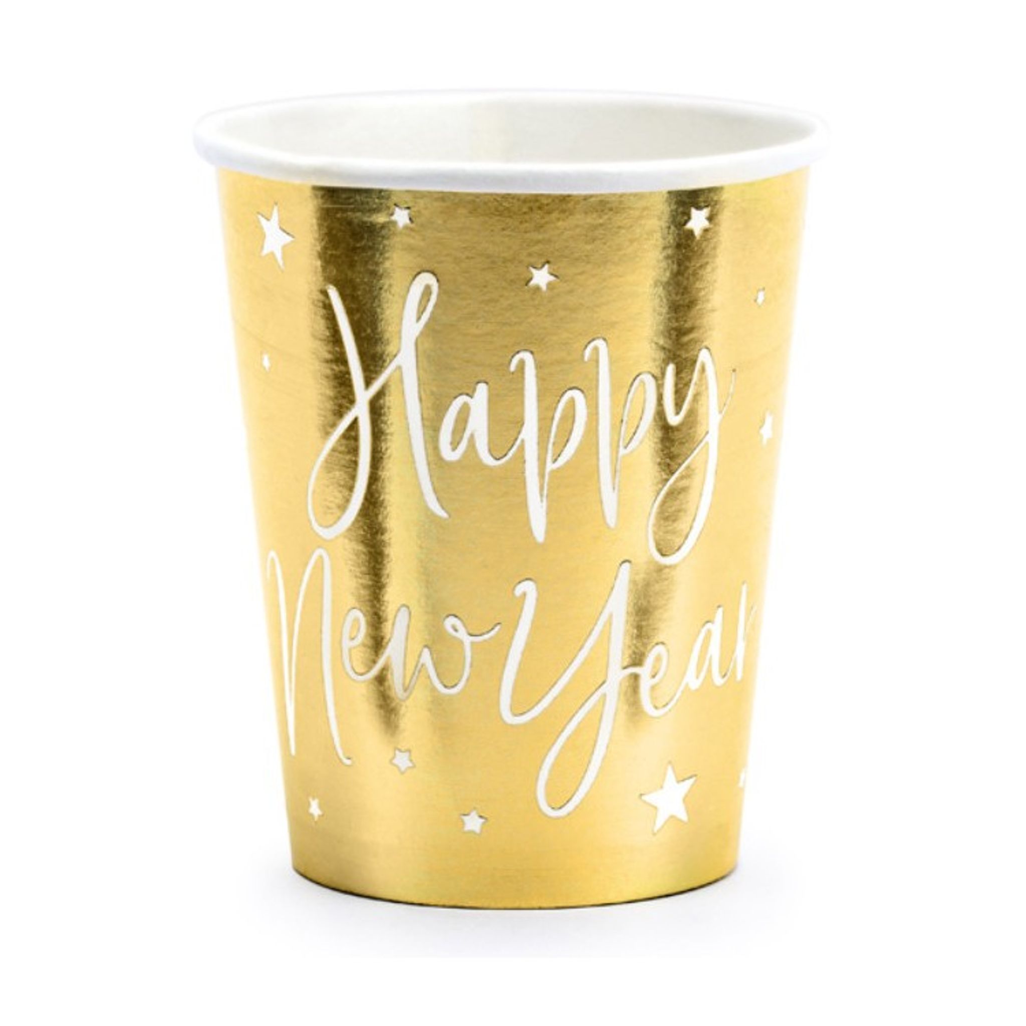 6 st mycket snygga pappersmuggar i högblank guld med texten Happy New Year. Duka med muggarna till Nyårsfesten och matcha gärna med tallrikarna som är i samma serie.