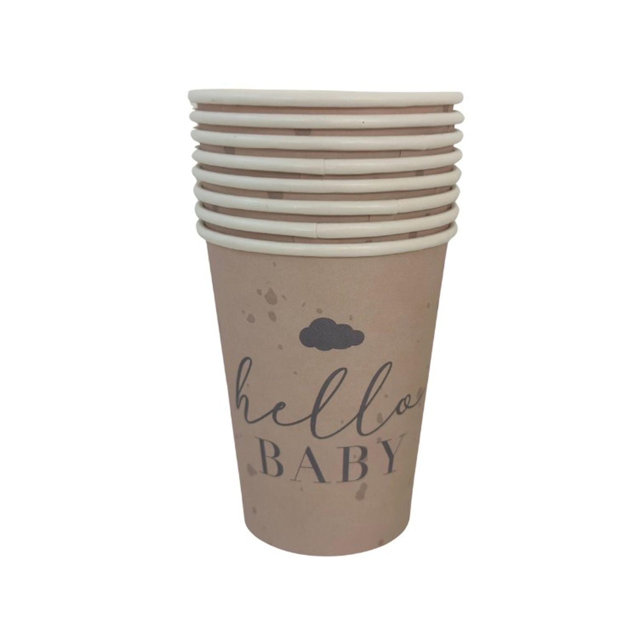 Duka upp för ett överraskande firandet av babyn. Utmärkta till allt från babyshower till dop och gender reveal party. Dessa pappersmuggar med beige spräcklig botten och mörkgrått moln samt mörkgrå text är utmärkt att servera drycken ur.