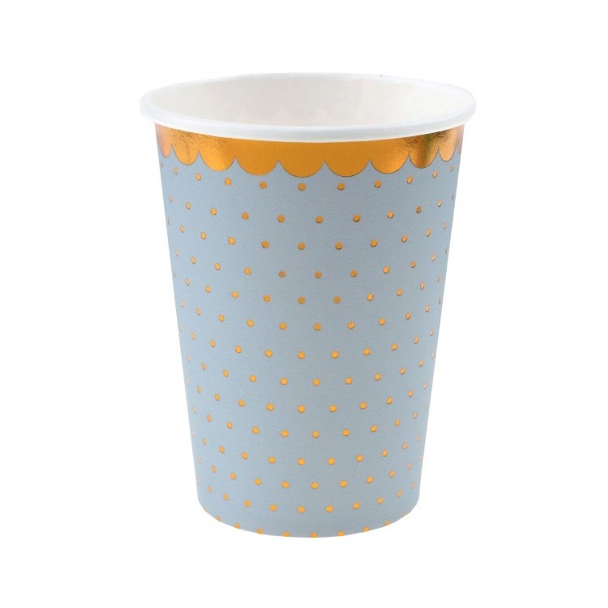 Pappersmuggar i ljusblått med detaljer i folierat guld. Duka upp med dessa till barnkalaset, dopet eller andra tillställningar när du önskar fina pappersmuggar till dukningen.