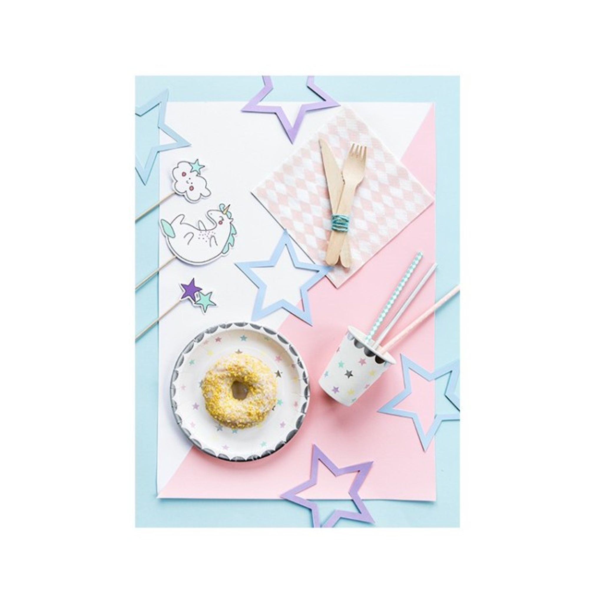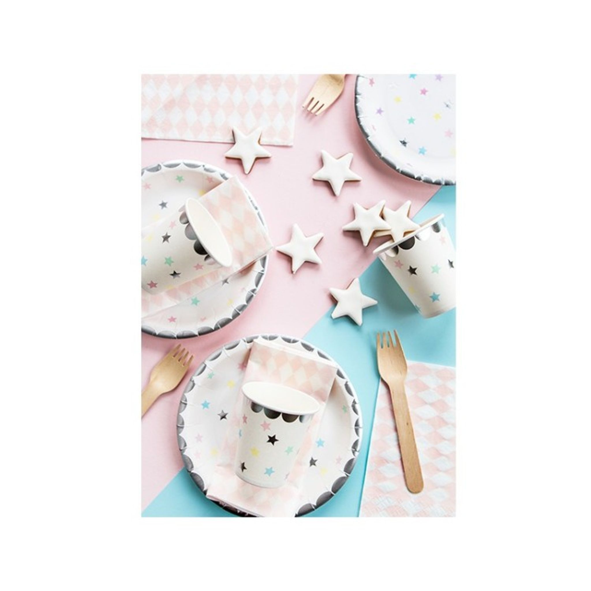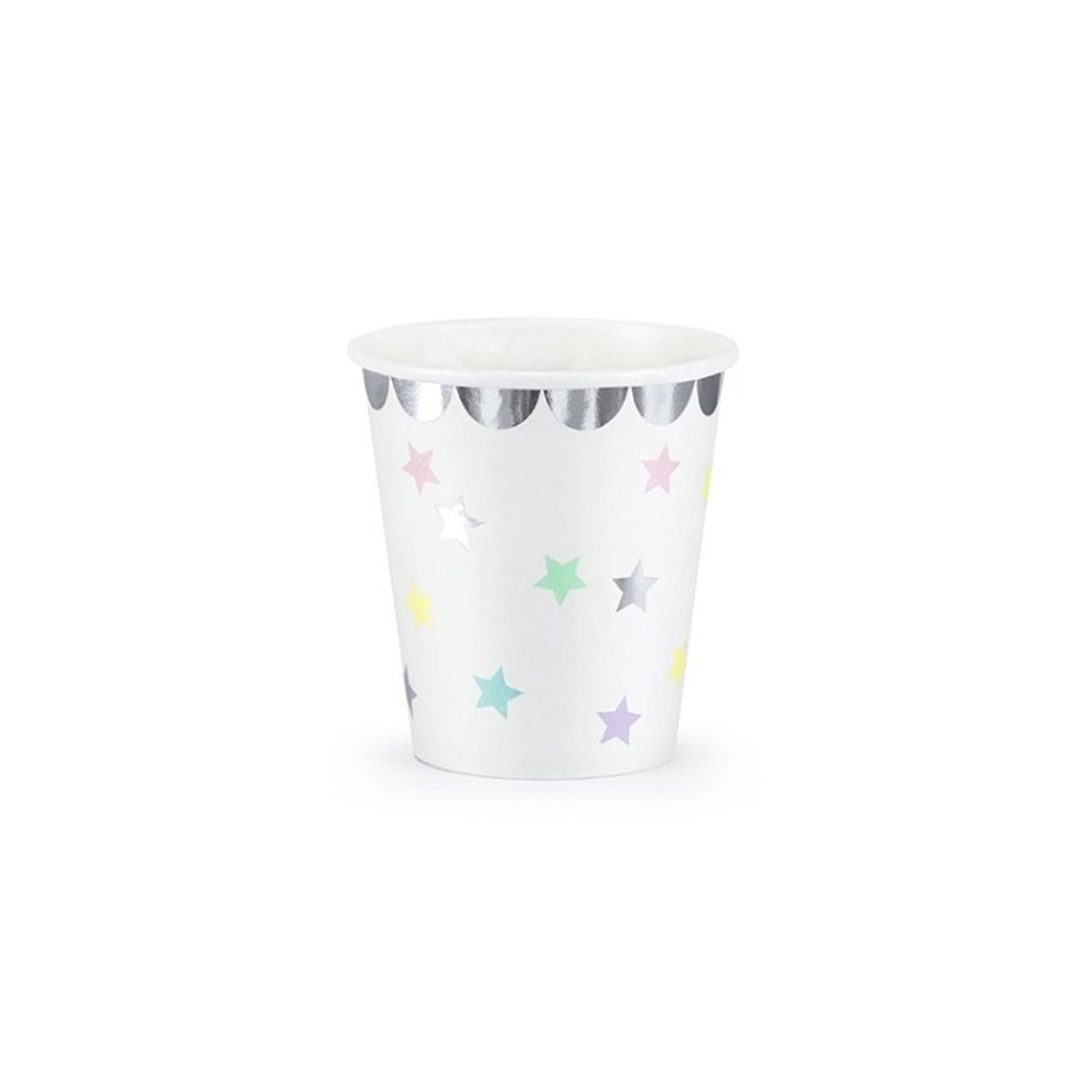 Praktiska muggar som du enkelt kan städa bort när kalaset är slut är den bästa lösningen för de flesta som vill anordna ett barnkalas eller annan fest. Dessa mycket söta pappersmuggar i vitt med pastellstjärnor och dekorativ silver kant blir perfekta till kalaset som skall ha tema pastell.