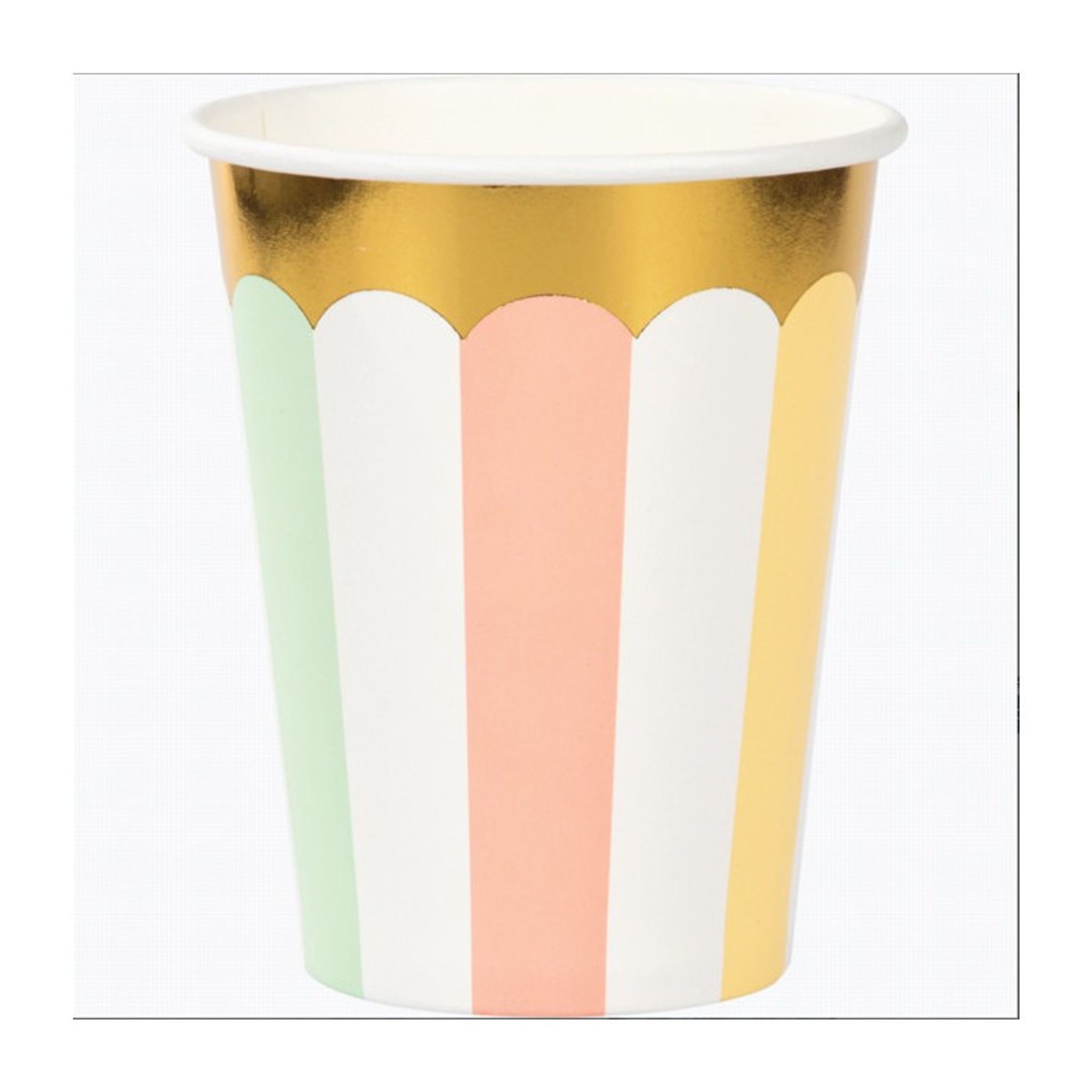 Duka upp till ett riktigt fint pastell och karamelligt kalasfirande med hjälp av dessa fina pappersmuggar. Engångsmuggarna har ett fint mönster av pastelliga ränder och guldkant som gör det enkelt att matcha med andra pastellprodukter. Duka gärna med våra tallrikar och servetter i samma serie.