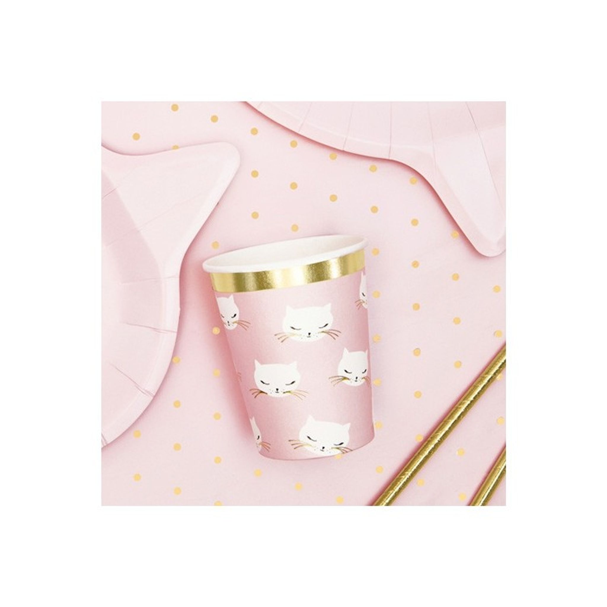 Söta pappersmuggar i fin rosa färg med motiv av gulliga katter. Pappersmuggarna har fina detaljer i guld och passar perfekt till alla typer av kalas och fest men kanske allra bäst för dig som gillar katter,