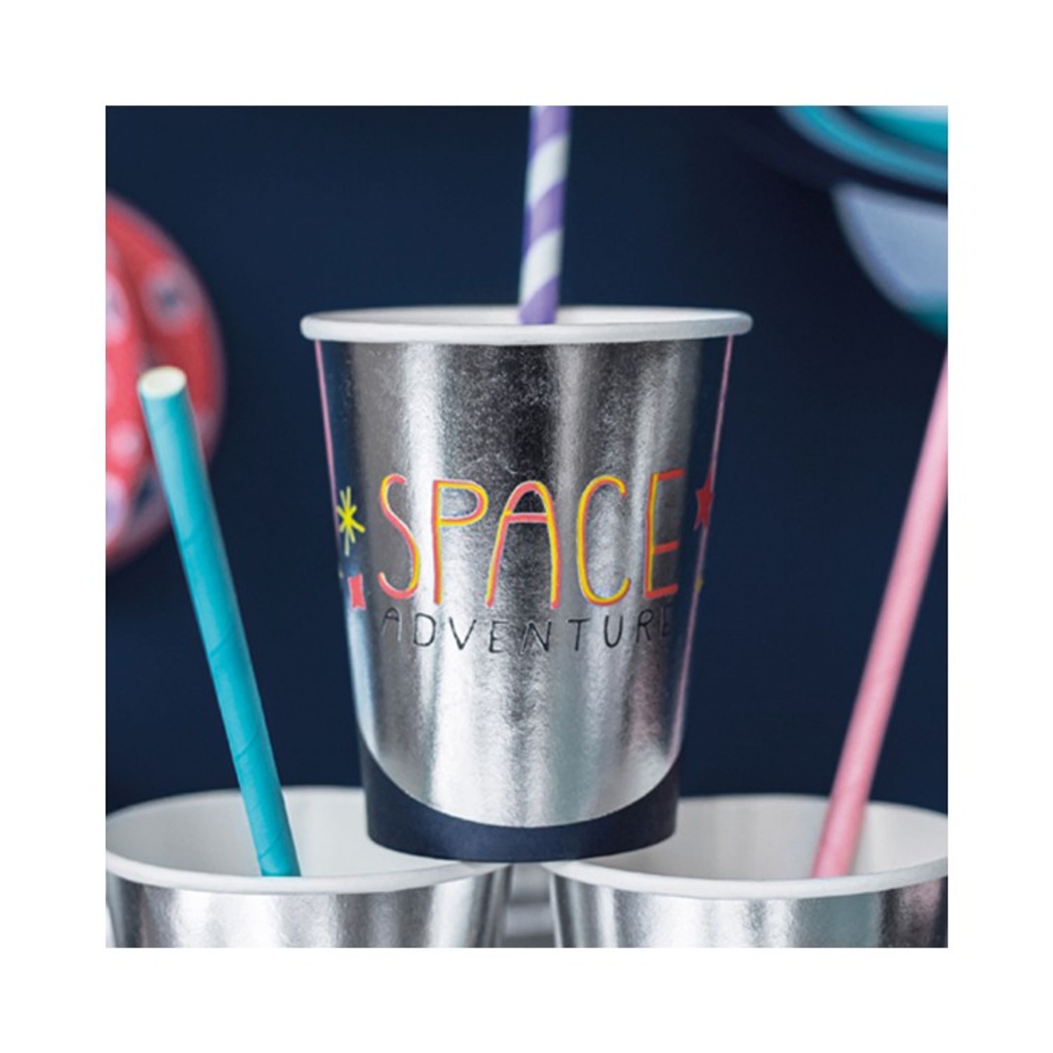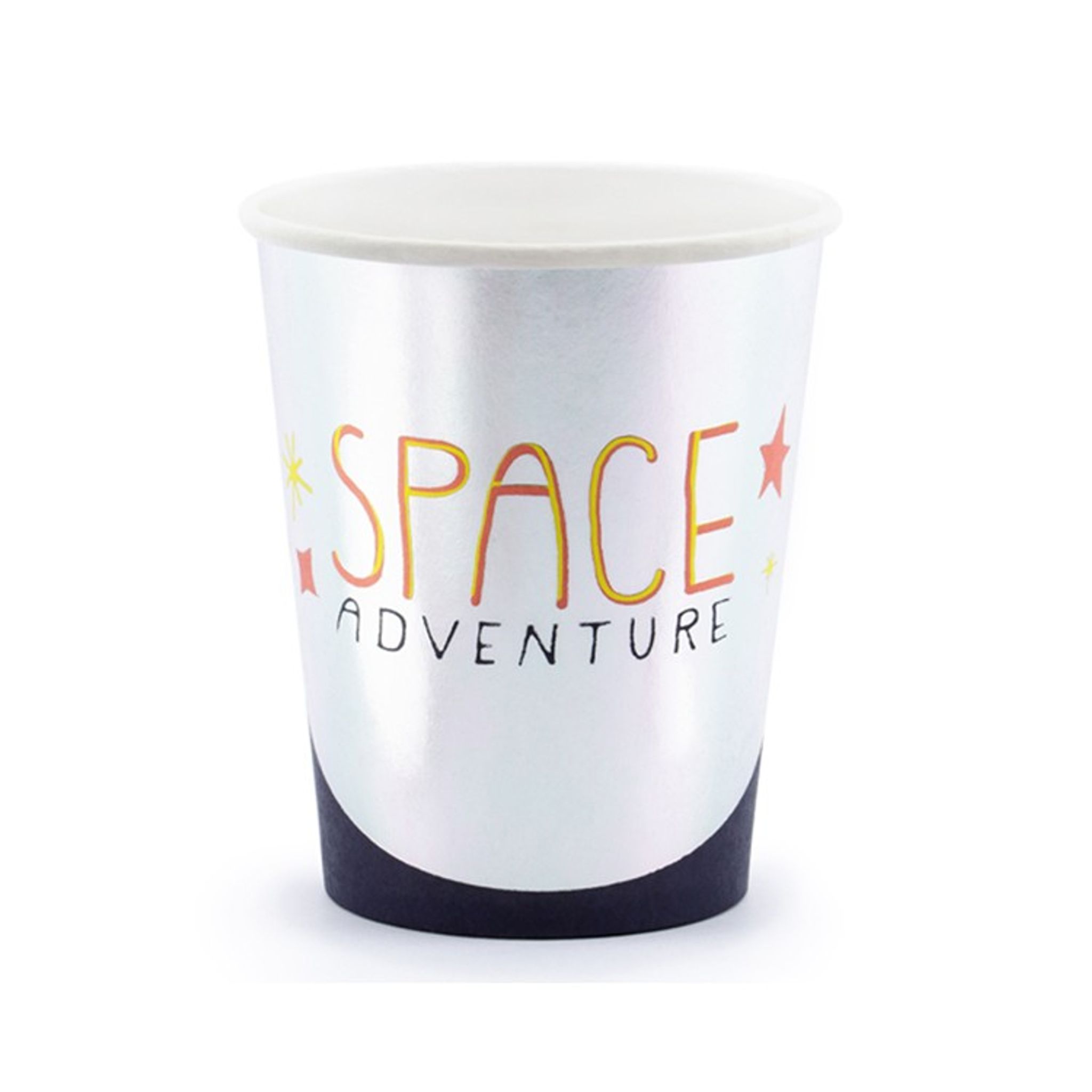 Bjud in vännerna på ett rymdäventyr! Dessa muggar i glansig silver är perfekt att dricka kalasdrycken ur på rymdäventyret. Priset avser 6 stycken muggar.