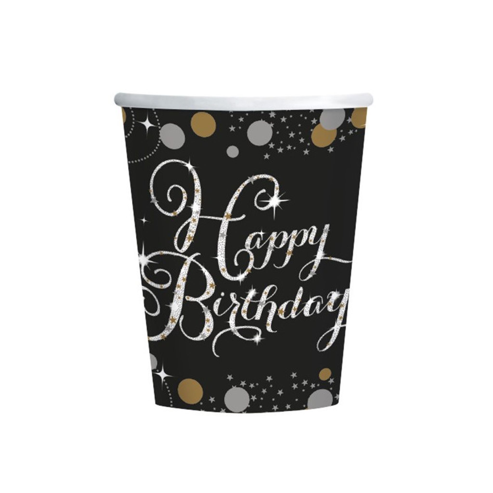 Bjud in till fest och servera valfri dryck i de här läckra pappersmuggarna. Muggarna är matt svarta i botten med detaljer i både guld och silver. På ena sidan står det Happy birthday. Ett pappersmugg som passar på olika födelsedagsfiranden när du vill dekorera med detaljer i svart, guld och silver.