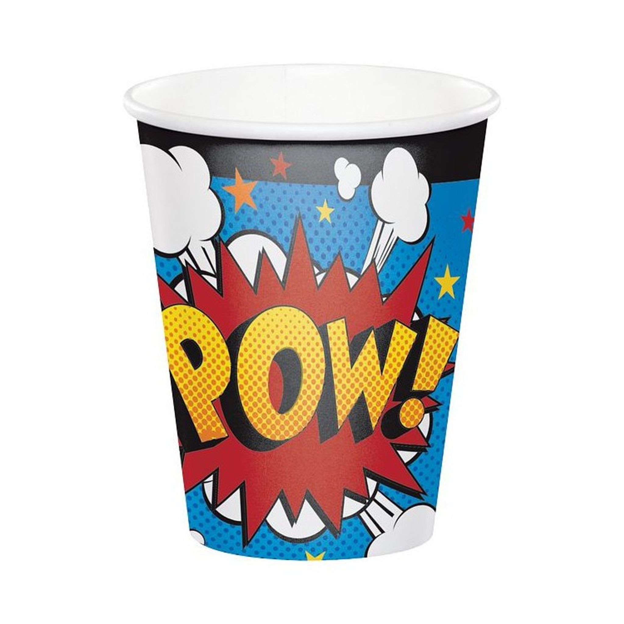 POW! Bjud in till ett spännande superhjältekalas och glöm inte att duka upp med rätt kalasdekorationer. Vad sägs om dessa coola pappersmuggar till superhjältekalaset? Muggarna är blåmönstrade i grunden med ett motiv som säger att superhjältarna är i närheten!