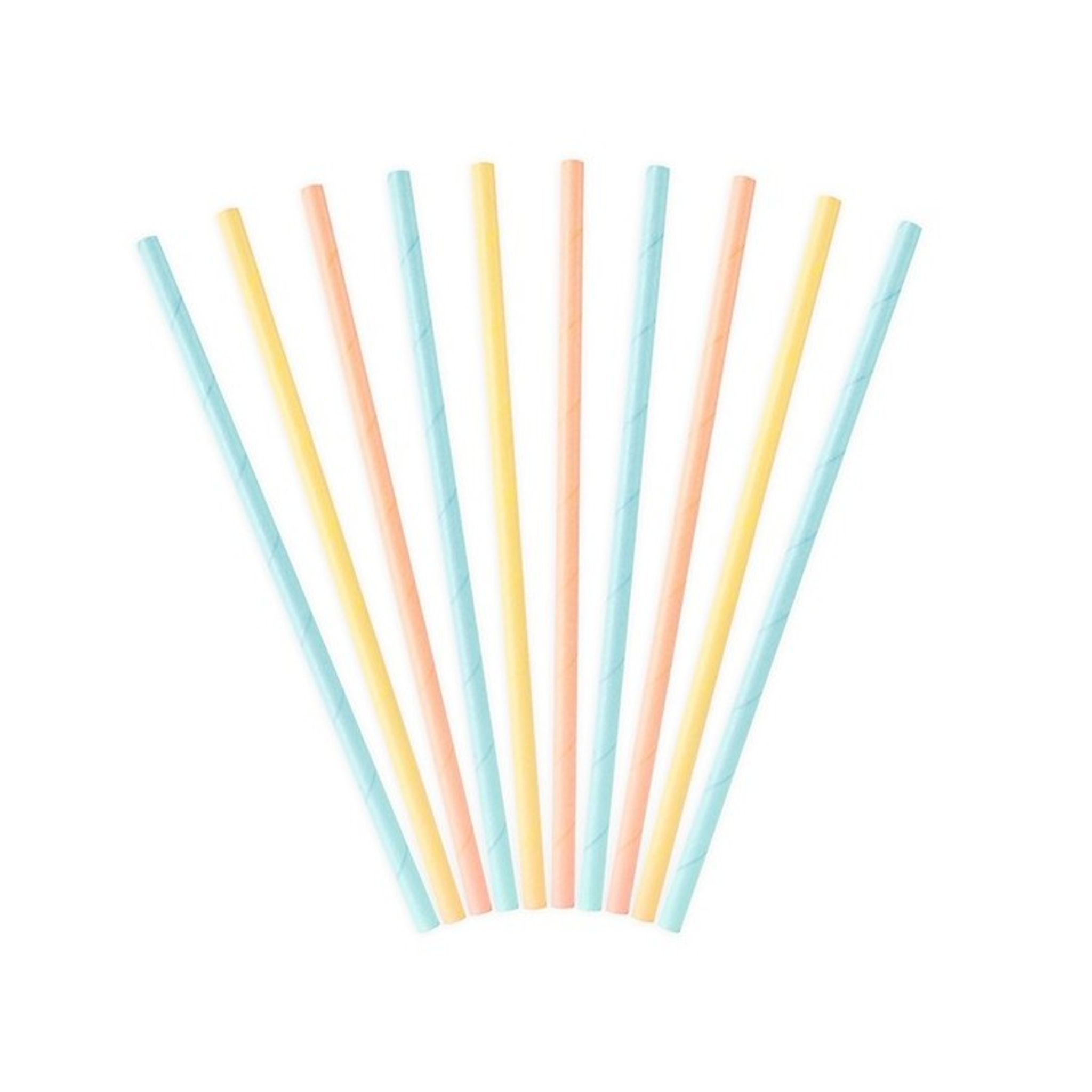 En förpackning innehåller 10 stycken papperssugrör i tre olika pastellfärger. Varje förpackning har 4 blåa, 3 gula och 3 rosa sugrör med längden 19.5 cm.