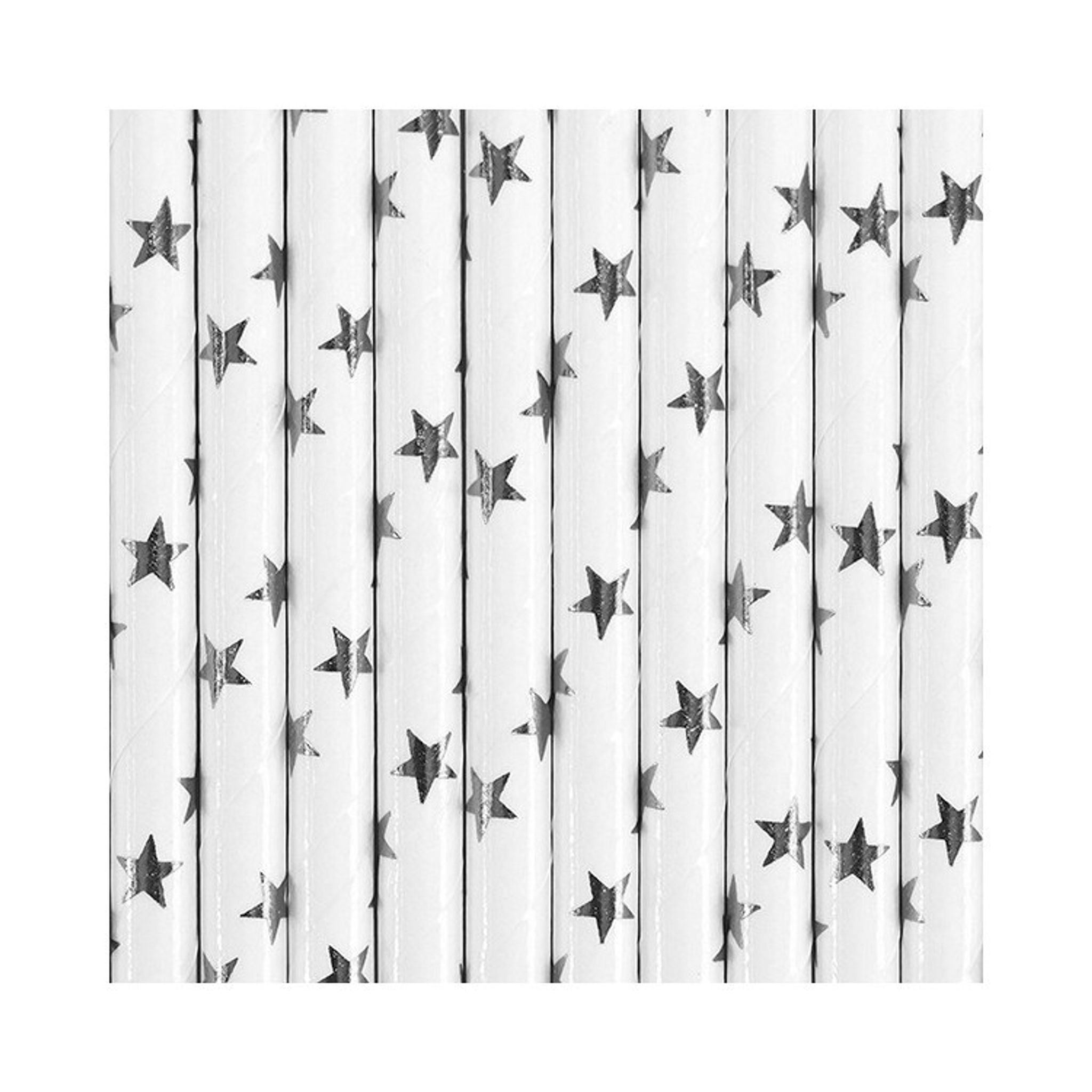 Eleganta papperssugrör i vitt med små stjärnor i metallic silver – perfekta för nyår, dop, vinterfester, babyshowers eller andra tillfällen med ett glittrigt tema. Sugrören är ca 19,5 cm långa och passar utmärkt till kalla drycker som saft, läsk eller bubbel. Tillverkade i papper för engångsbruk och kommer i 10-pack.