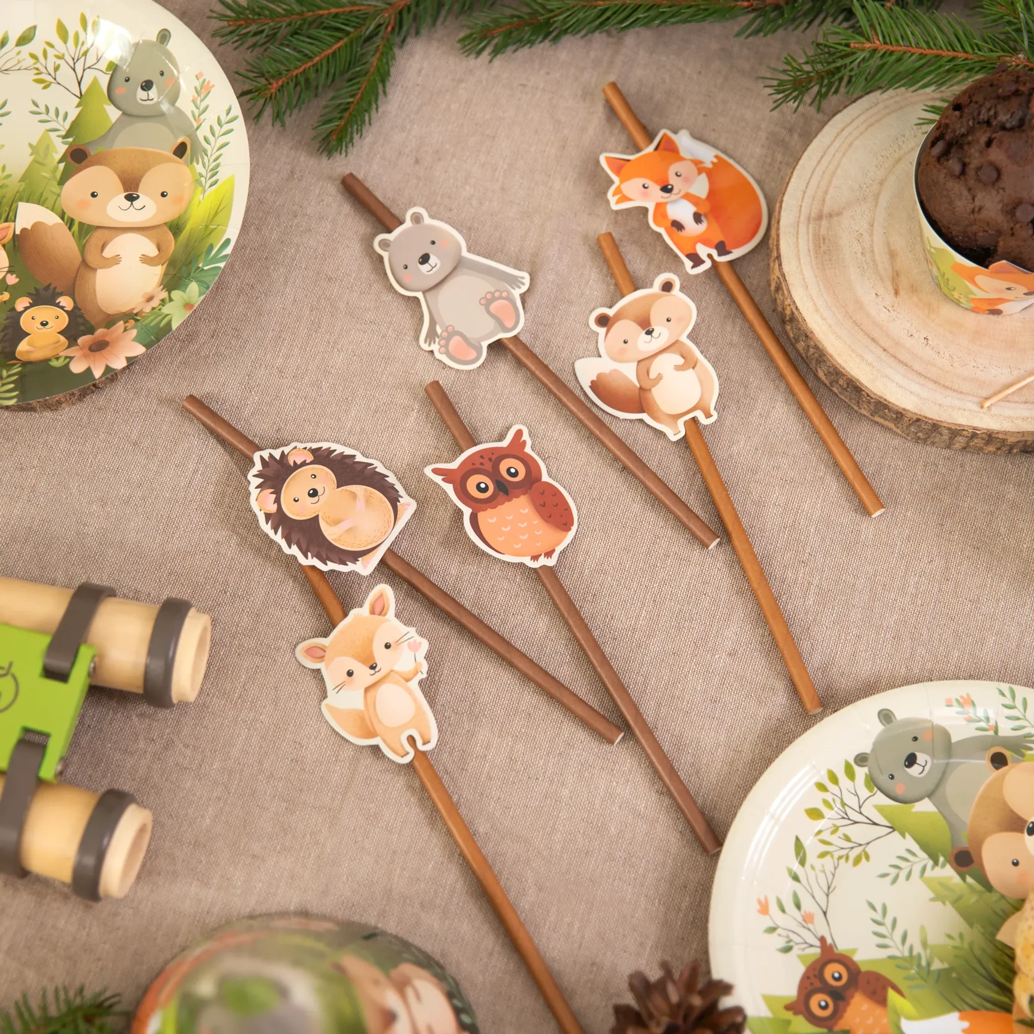 Dessa papperssugrör med söta motiv av sex olika skogsdjur i varma bruna toner blir en härlig detalj på barnkalaset. De färgglada djurillustrationerna, som inkluderar allt från rävar till ugglor, skapar en mysig och lekfull stämning som passar perfekt för små äventyrare och naturälskare. Sugrören är lagom långa för små händer och drycker och gör festen ännu roligare. Perfekt att matcha med övrigt Skogens Vänner-tema!