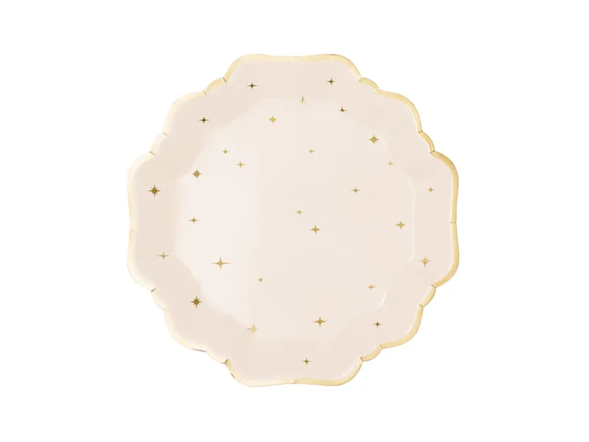 Duka upp till fest med dessa stilfulla papptallrikar med stjärnmönster! Tallrikarna är beige i bottenfärgen och dekorerade med små, glänsande guldfärgade stjärnor som ger en elegant och festlig känsla. Det subtila men effektfulla mönstret passar utmärkt till både barnkalas, nyår, dop, babyshower eller andra firanden där du vill ha en dukning med lite extra stjärnglans.