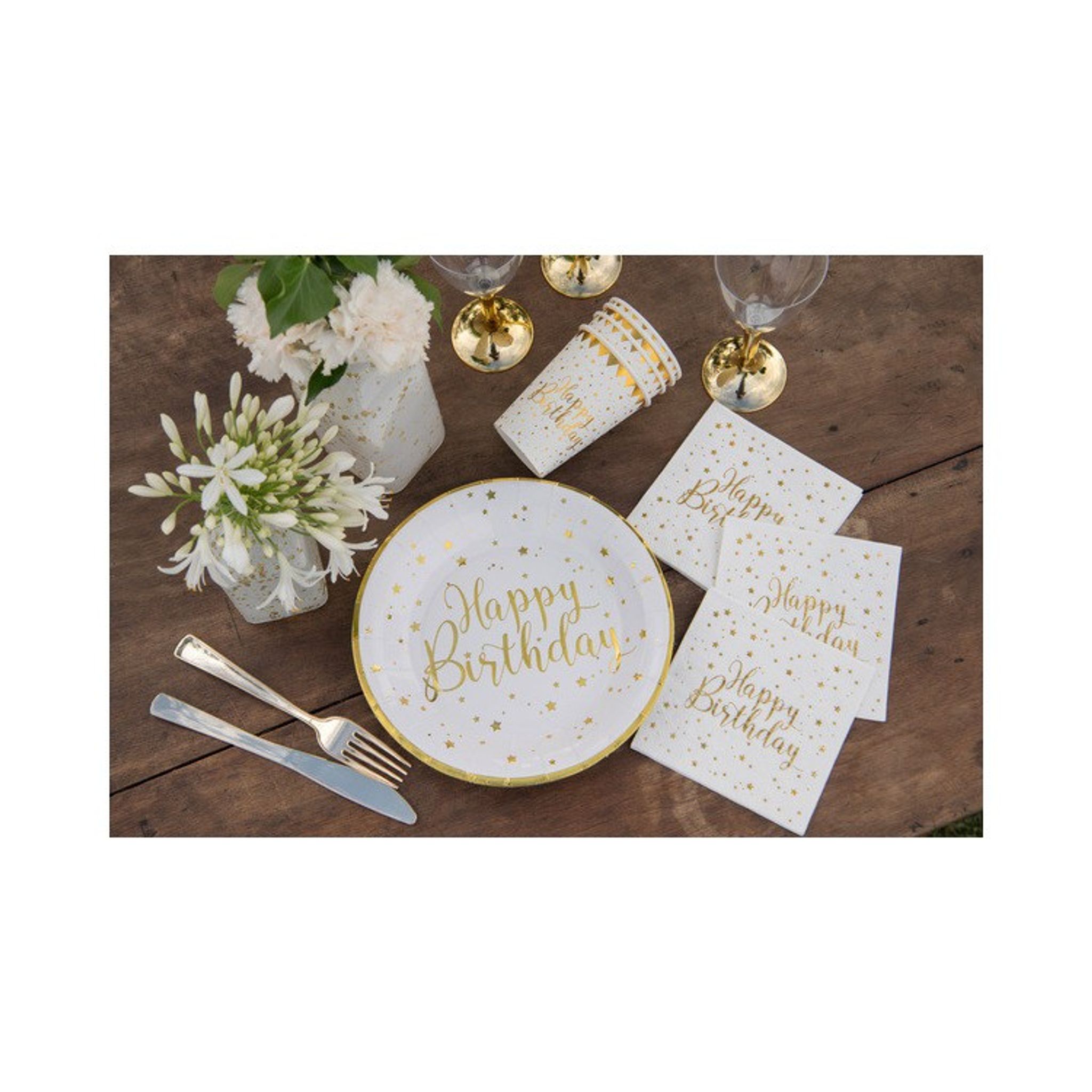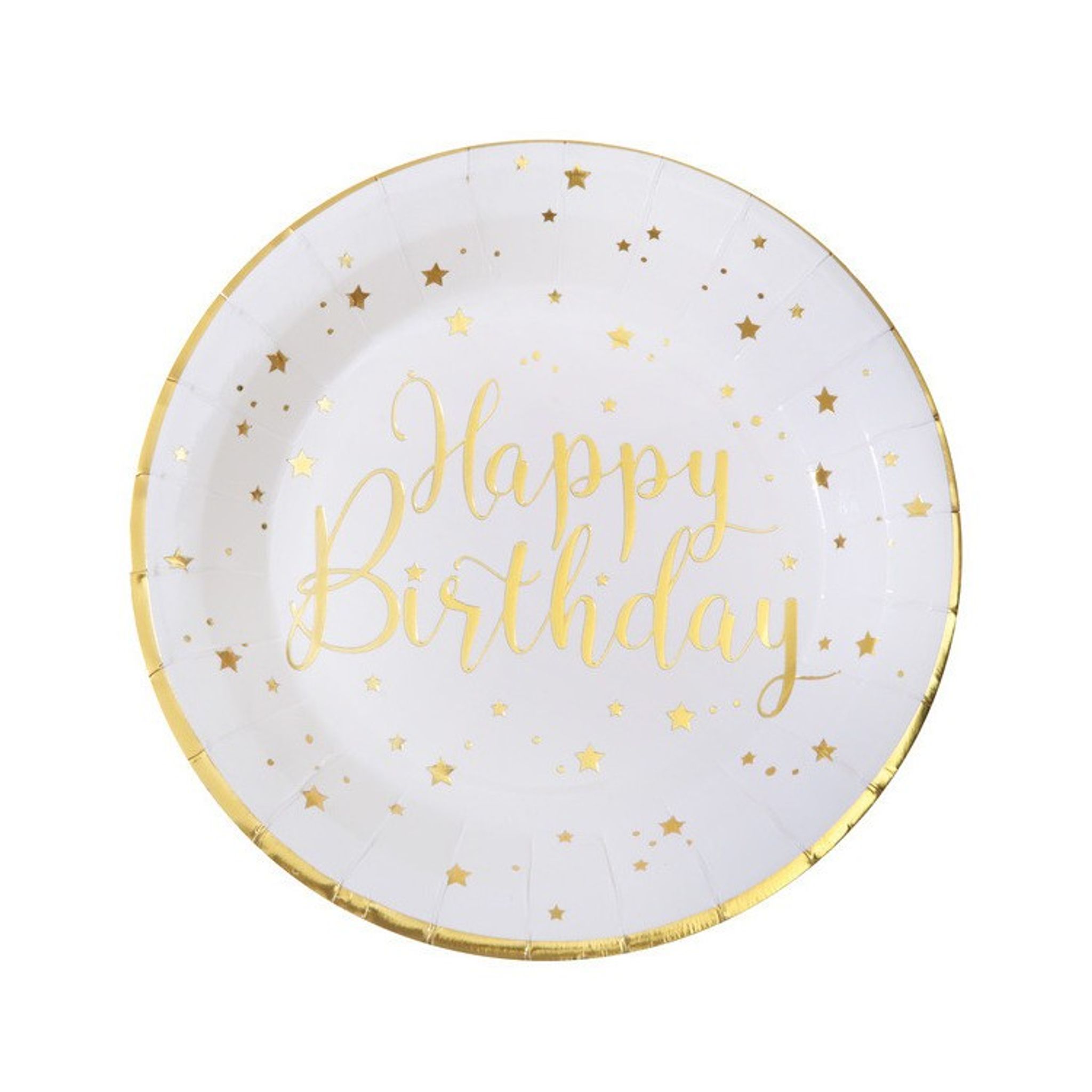 Snygga papperstallrikar som passar perfekt vid dukningen på födelsedagsfesten. Tallrikarna är vita med båda kant, stjärnor samt texten "Happy Birthday" i skimrande guld.