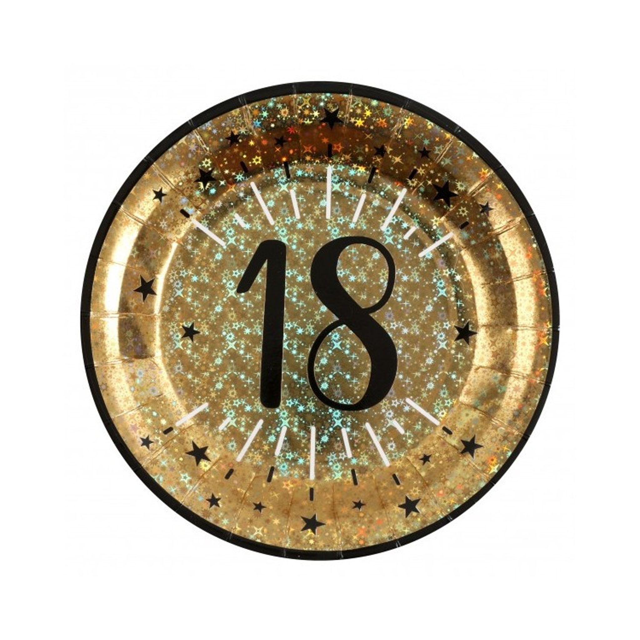 Guldiga papperstallrikar med 18-års motiv.