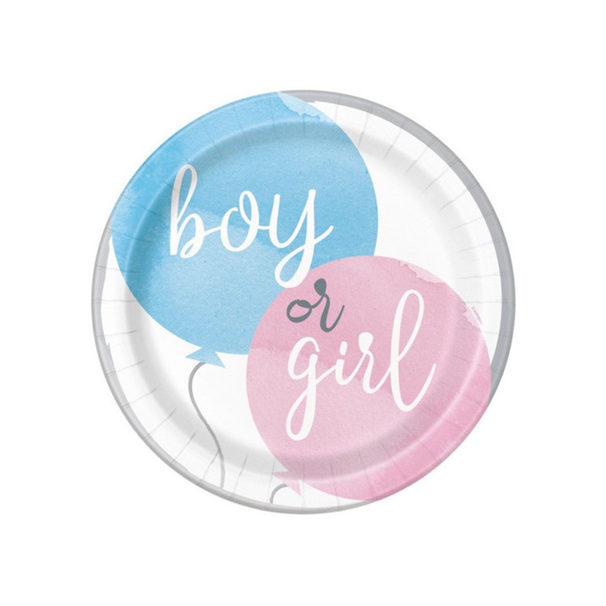 Planerar du att ha en babyshower eller kanske en Baby Reveal fest för att avslöja för dina vänner om det blir en pojke eller flicka? Papperstallrikar med vit botten och en ljusblå och en ljusrosa ballong på med texten boy or girl, perfekta att duka med på babyshowern eller på Gender Reveal Partyt. Mixa och matcha med vårat övriga sortiment av kalasartiklar till babyshowern.