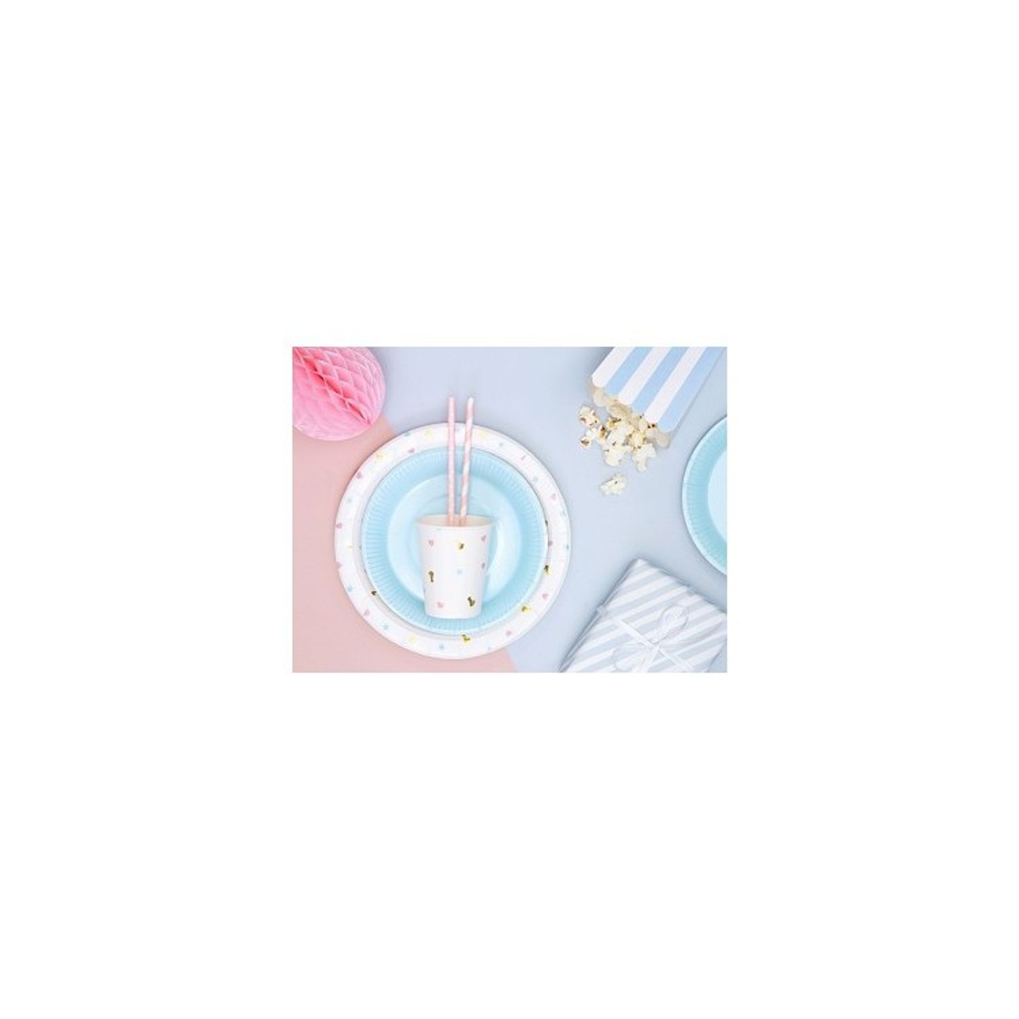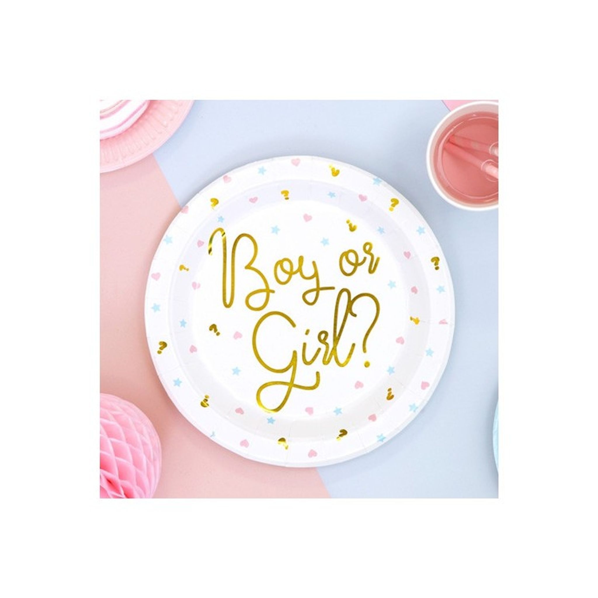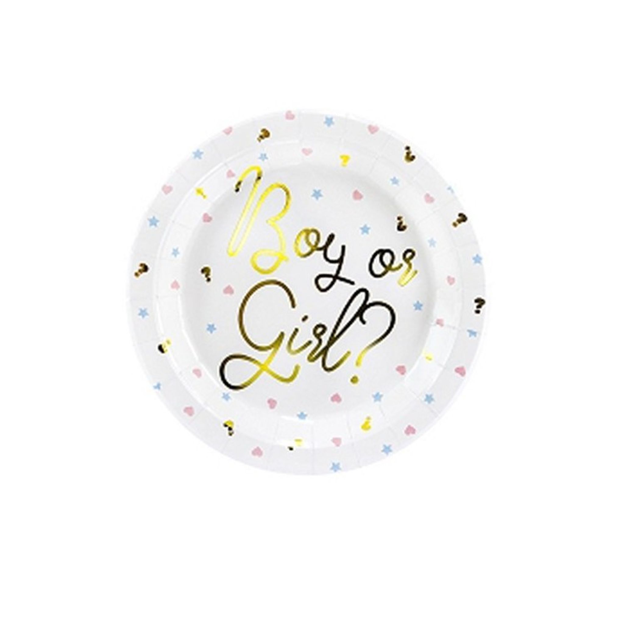 Planerar du en Babyshower eller en Baby Reveal Fest? Då passar dessa papperstallrikar perfekt. Här får du nämligen vita tallrikar med texten "Boy or Girl?". Texten är i guld och tallrikarna har även motiv av små rosa hjärtan, ljusblåa stjärnor samt frågetecken i guld.