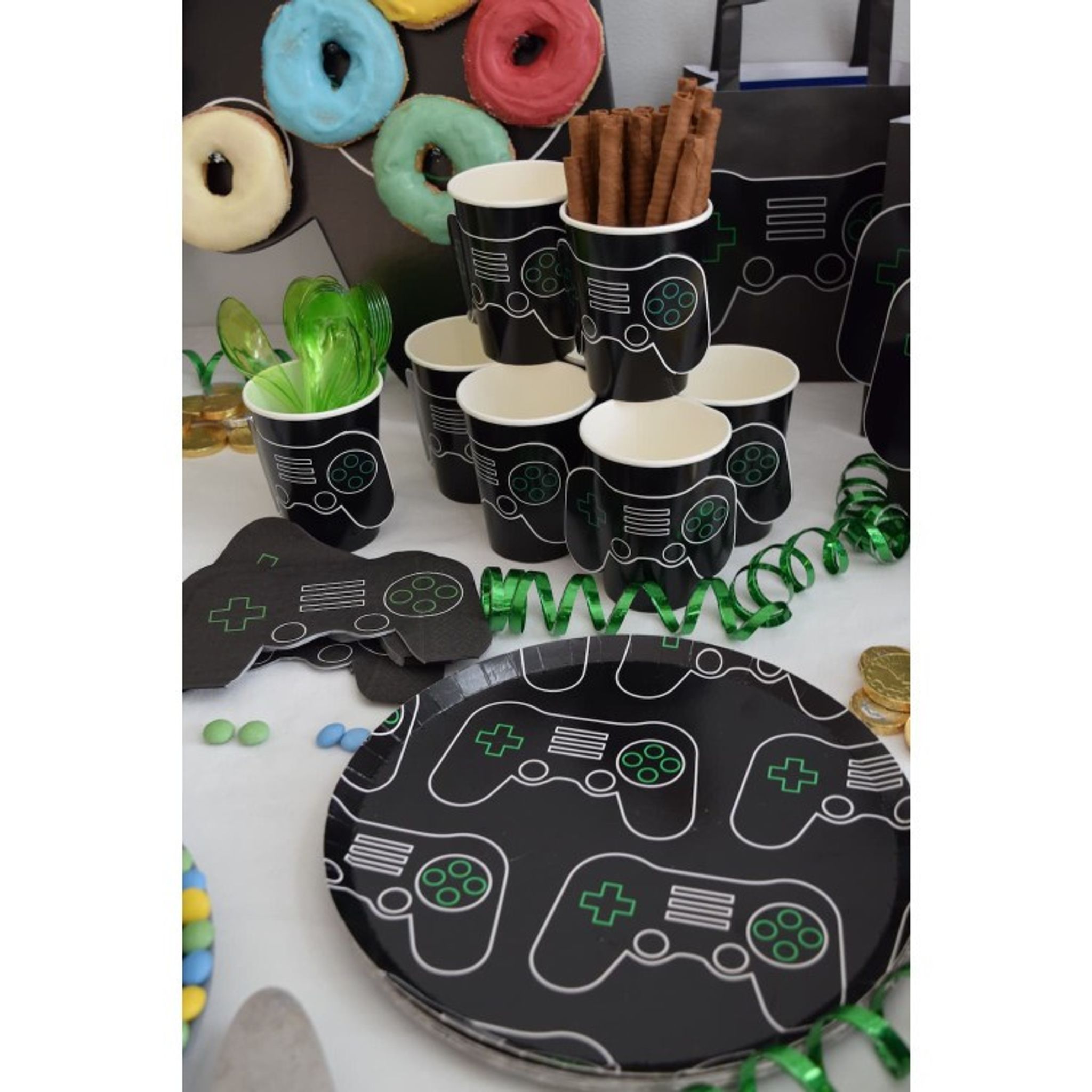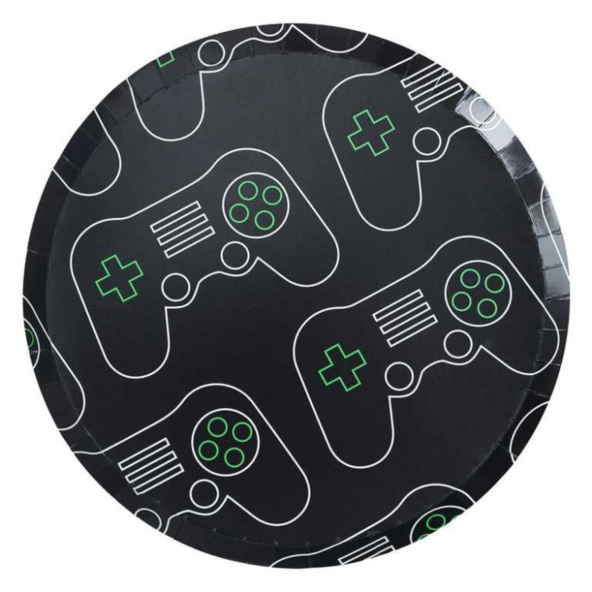 Perfekta för barnkalaset eller tema-festen. Vankas det fest för gaming-entusiasten är dessa eco-vänliga tallrikar det givna valet. 8 stycken tallrikar i svart papp med handkontrollsmotiv i vitt och grönt som kommer ge festen en extra häftig känsla.