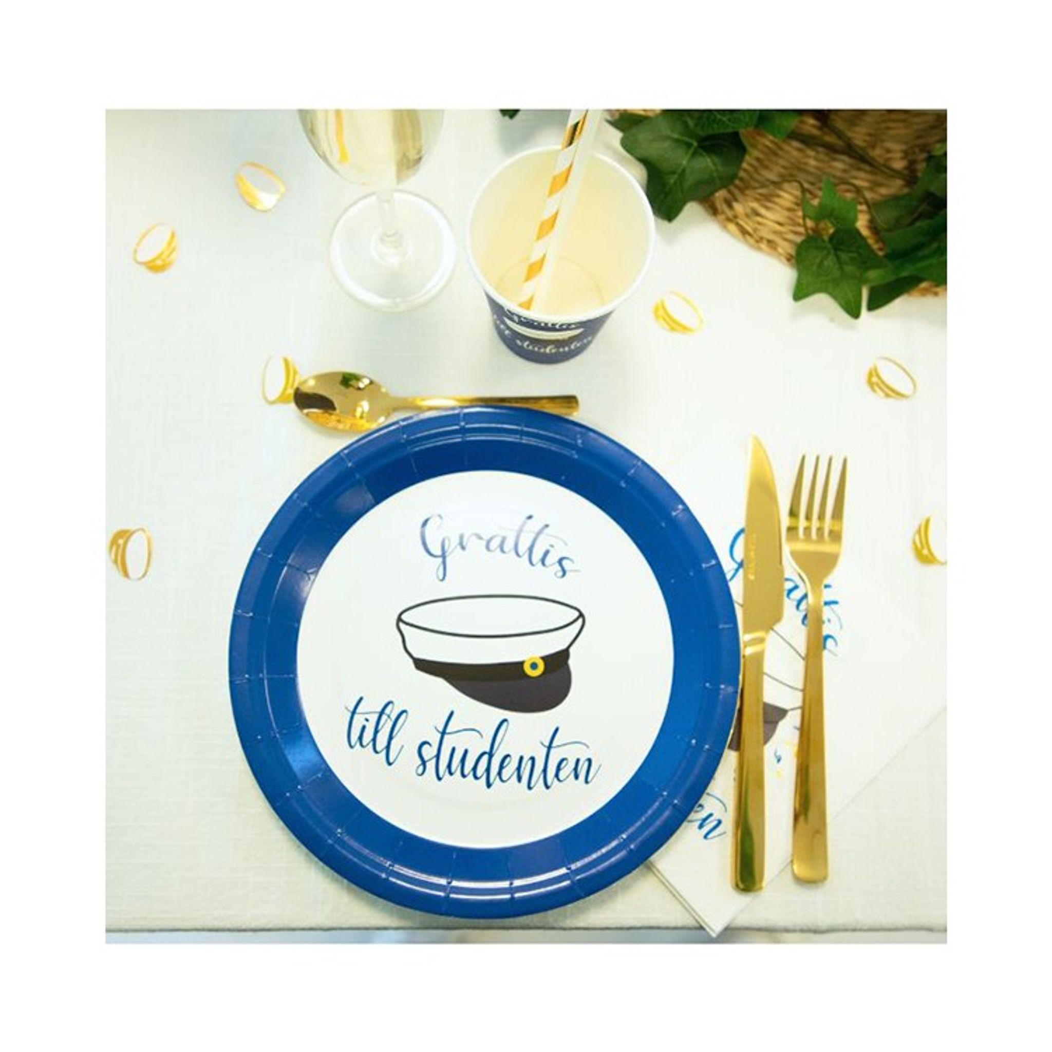 Papperstallrikar med vit botten och studentmössa med texten Grattis till Studenten. Priset avser 8 stycken papperstallrikar. Tallrikarna är 23 cm. Matcha gärna med servetter i samma serie.