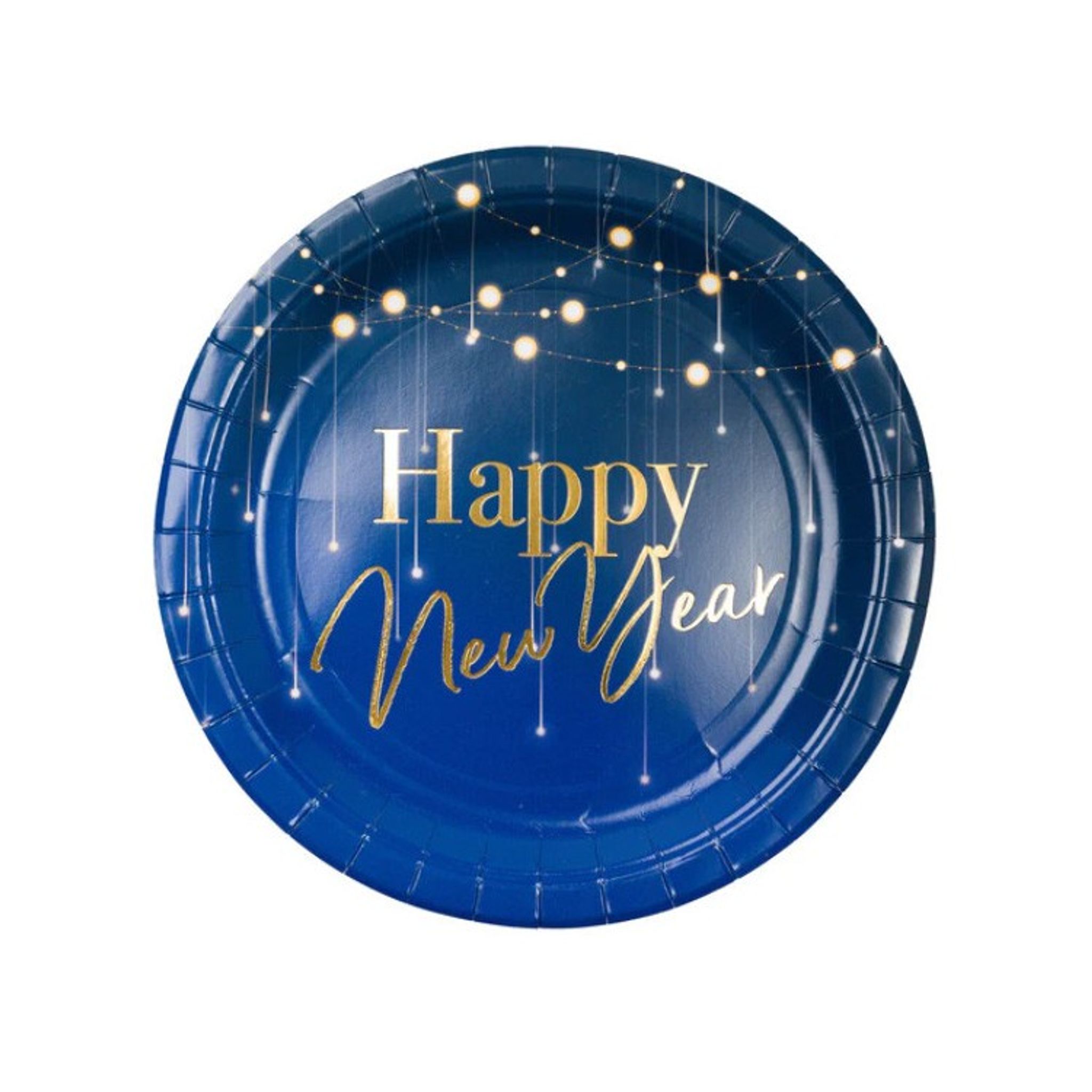 Tallrikar i papper, djupblå med gulddetaljer "Happy New Year".