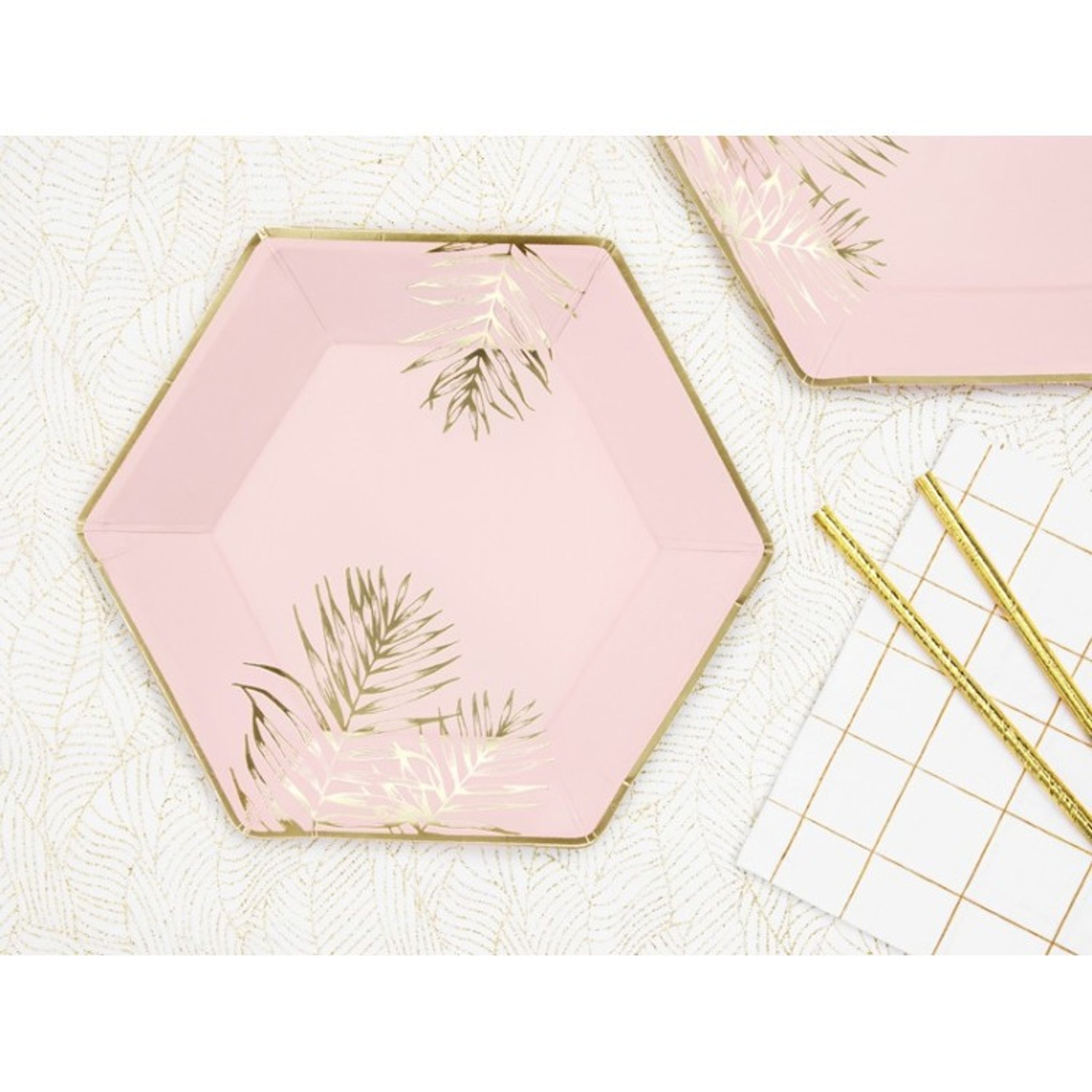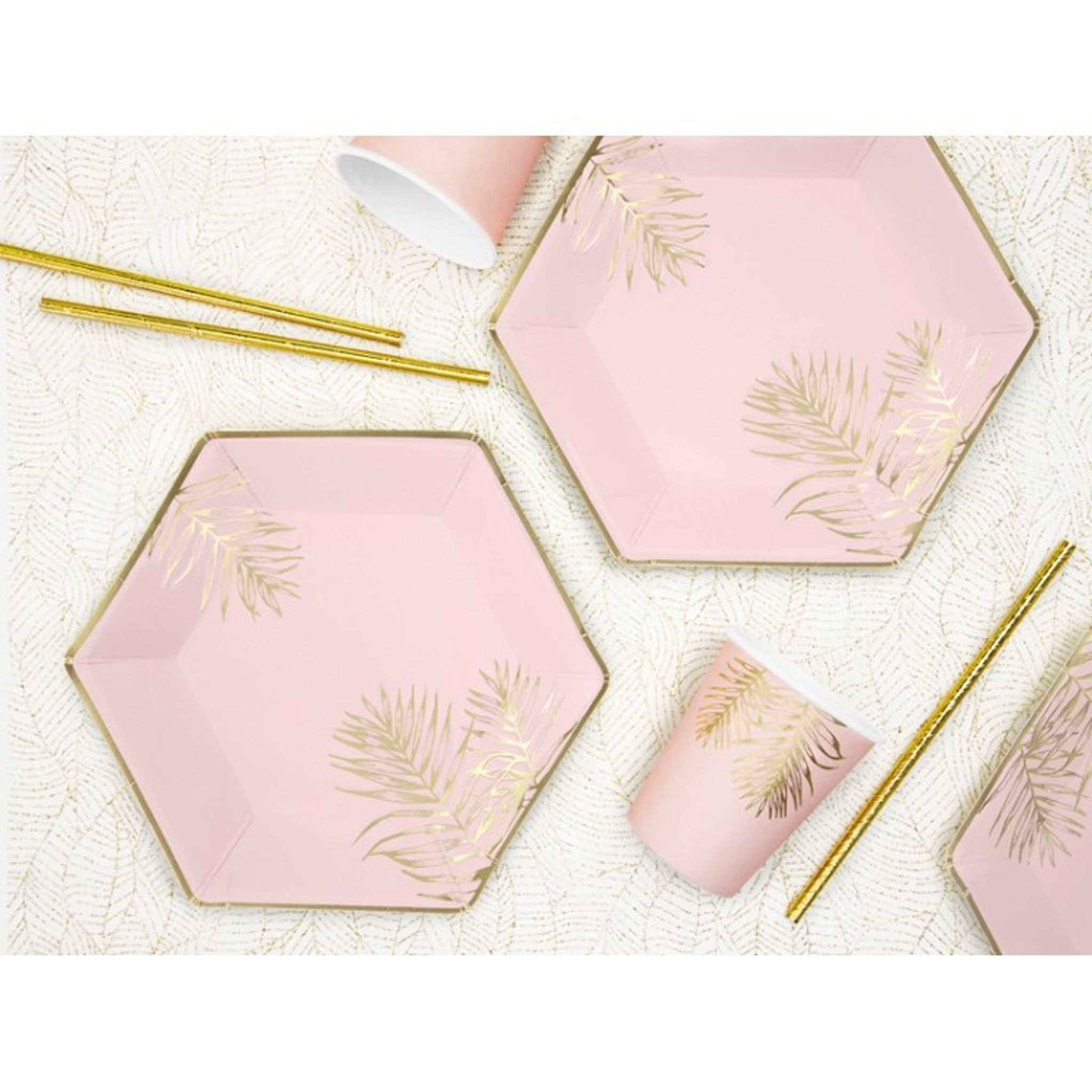 Här får du riktigt snygga hexagonformade tallrikar i en härligt ljusrosa nyans. Tallrikarna har sedan en guldkant samt motiv av guldiga palmblad. Mixa gärna med matchande muggar eller övriga produkter med just palmblad. Smidigt och enkelt när du vill slippa disken efter festen!