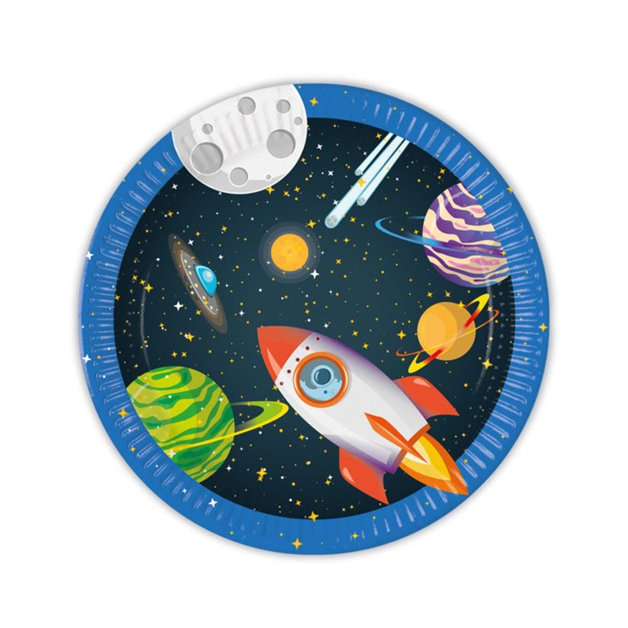 Papperstallrikar med coolt rymdtema. Bjud in ditt barns vänner till ett riktigt roligt Rymdkalas och duka praktiskt med våra snygga engångsartiklar.