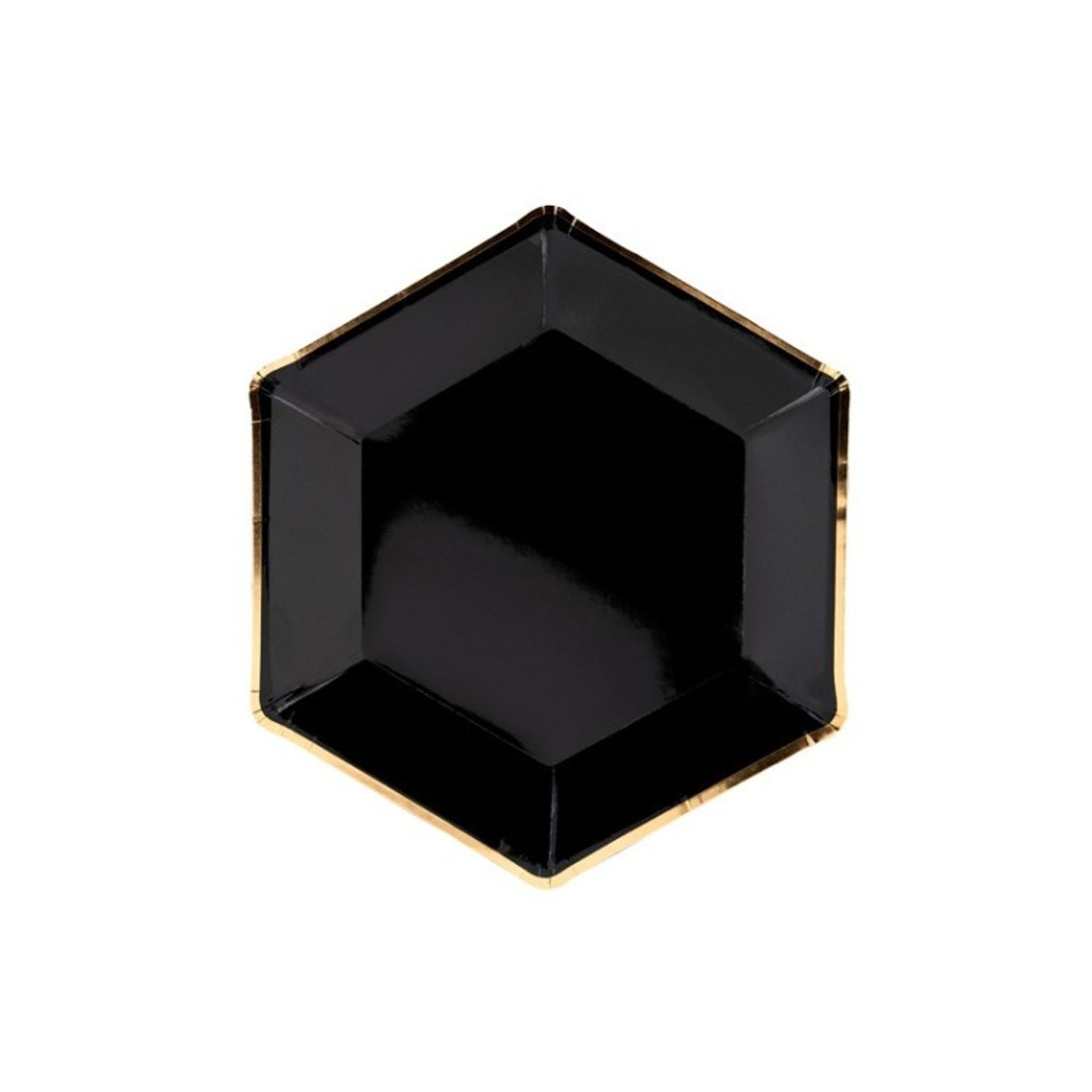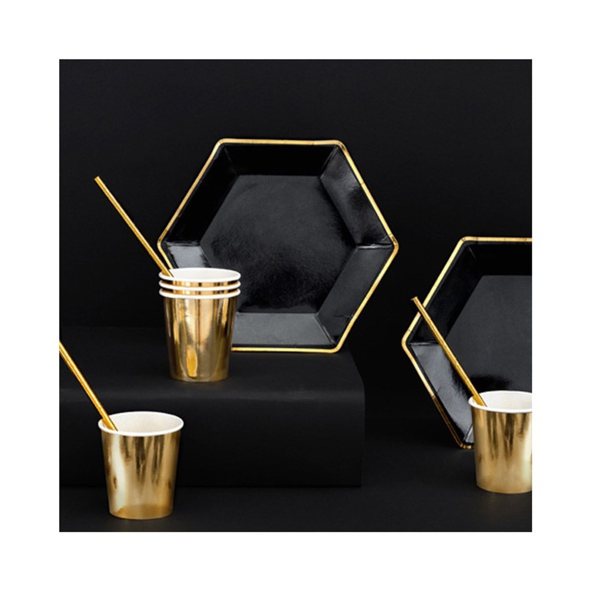 6 st mycket snygga svarta papperstallrikar med dekorativ guldkant. tallrikarna har en 6-kantig form och passar extra fint till Nyårsfesten. Duka gärna med våra snygga guldmuggar och högblanka guldduk för en snygg dukning och kombination.
