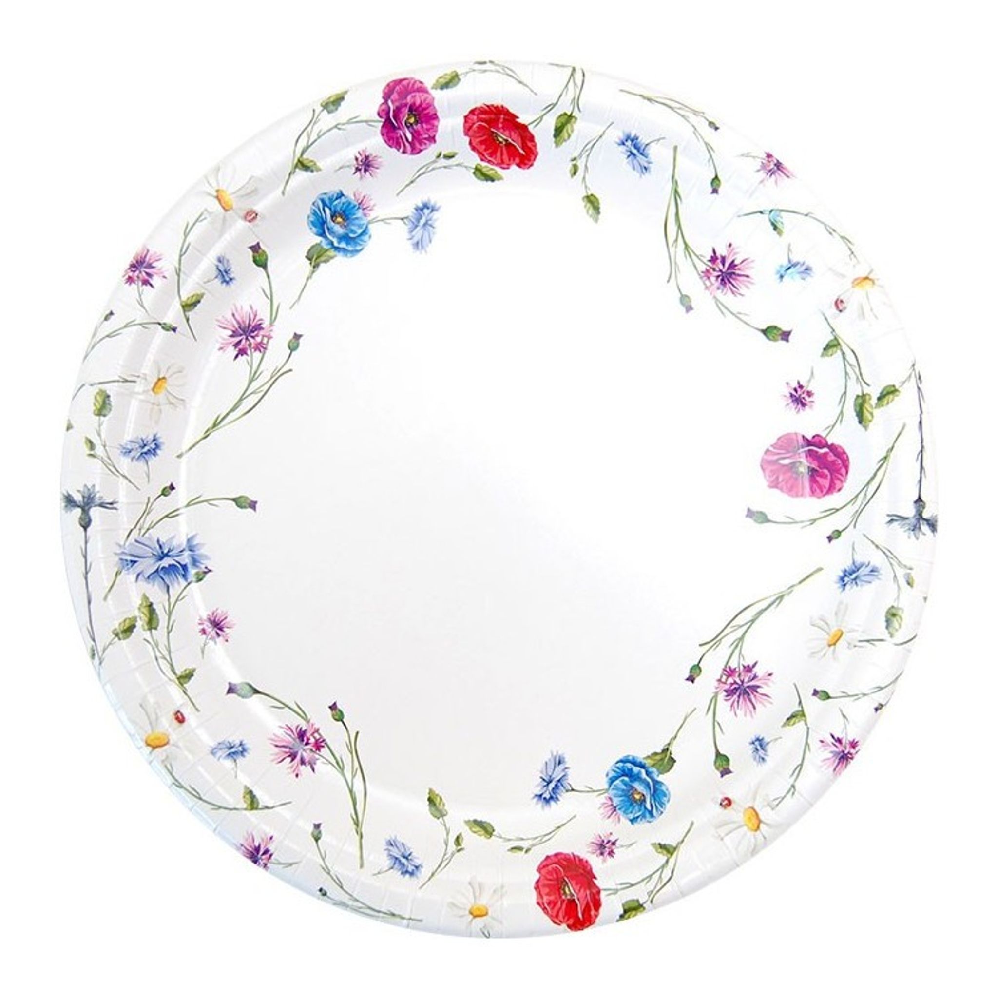 En förpackning innehåller totalt 8 stycken papptallrikar med fint somrigt blomstermotiv på en vit grund. Tallrikarna har en förhöjd kant vilket gör att maten enkelt håller sig på plats. Storlek i diameter: 25 cm.