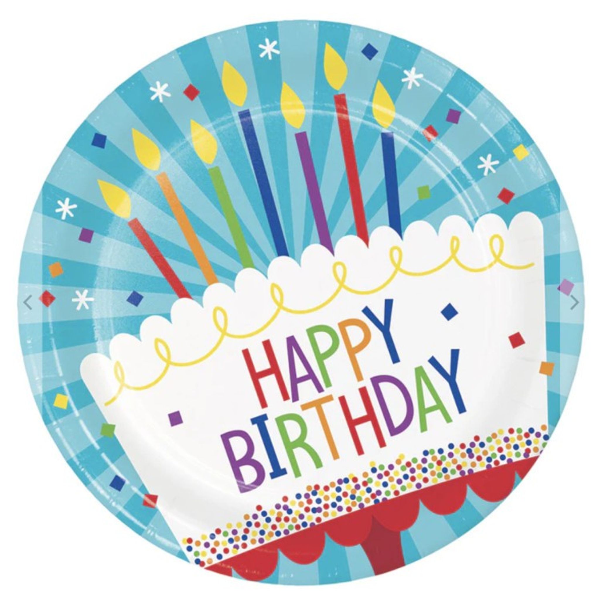 8 st färgglada papperstallrikar med motiv av en tårta och tårtljus. Tallrikarna har också texten Happy Birthday. Storlek: 23 cm Antal: 8st/förp