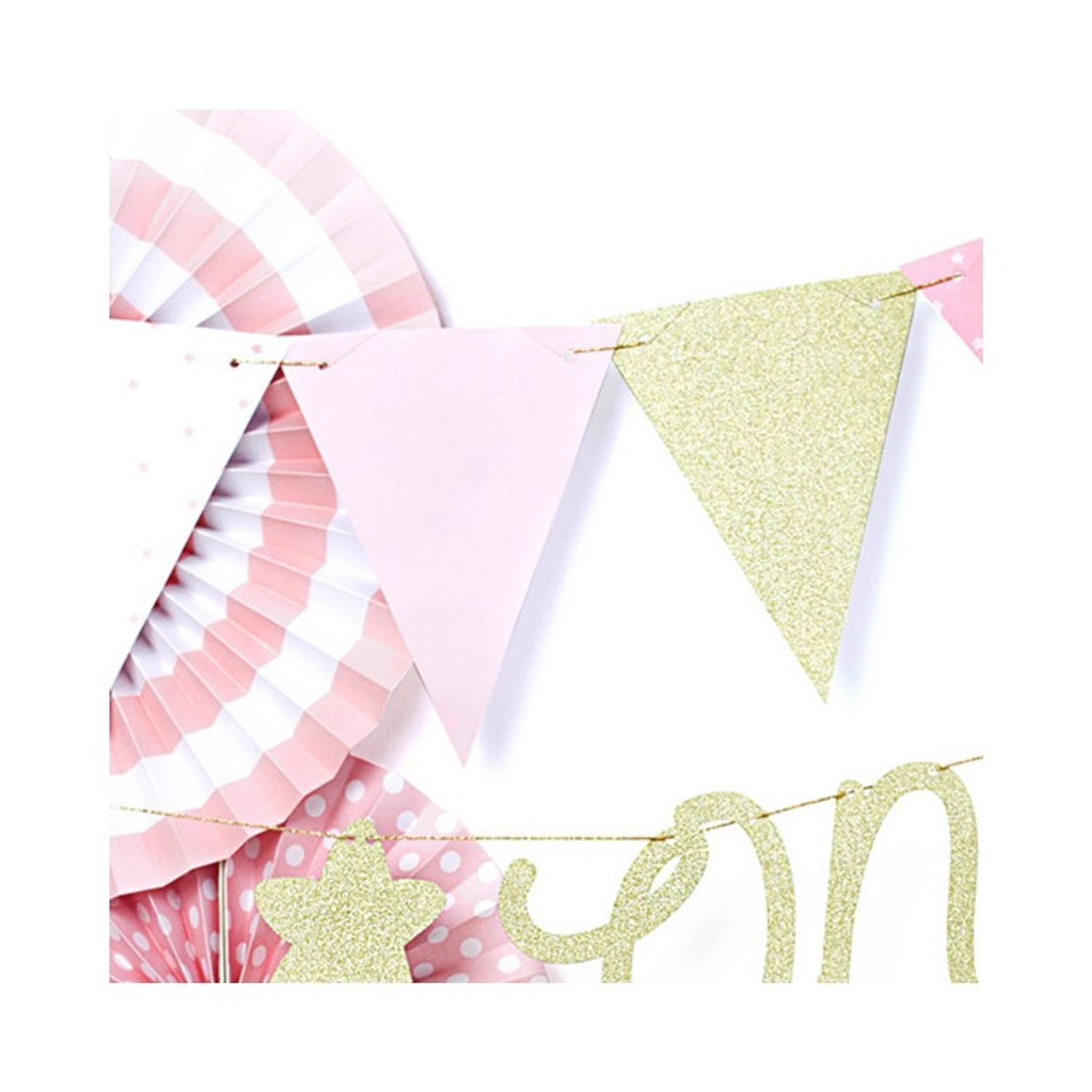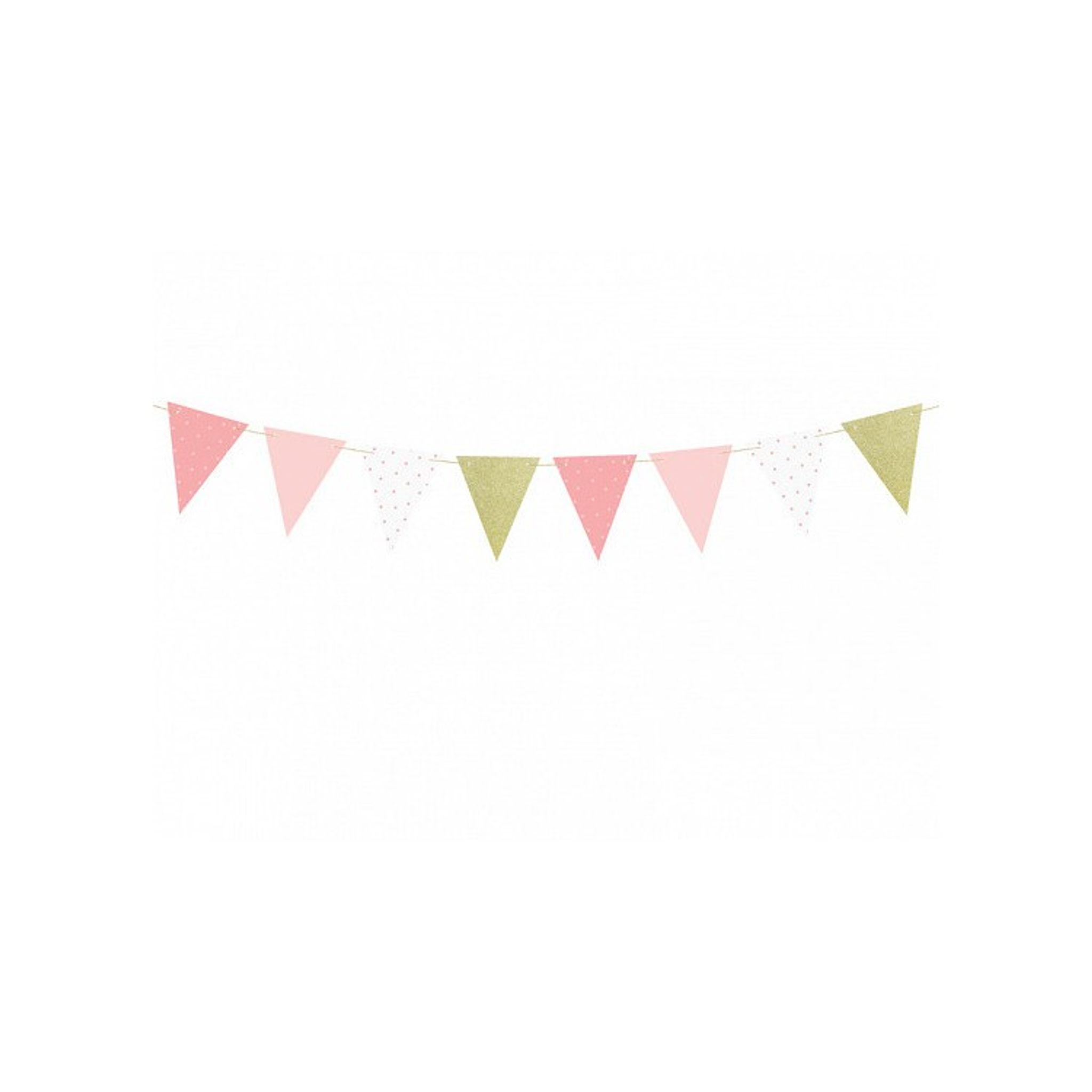 Flaggvimplar i fina ljusrosa och guld. Flaggorna har en mix av mönster och innehåller 8 flaggor och ca. 2 m guldsnöre. Dekorera fint med den här fina vimpelgirlangen i en härlig kombination av rosa och guld som passar lika bra till babyns första kalas som till vuxenfesten.