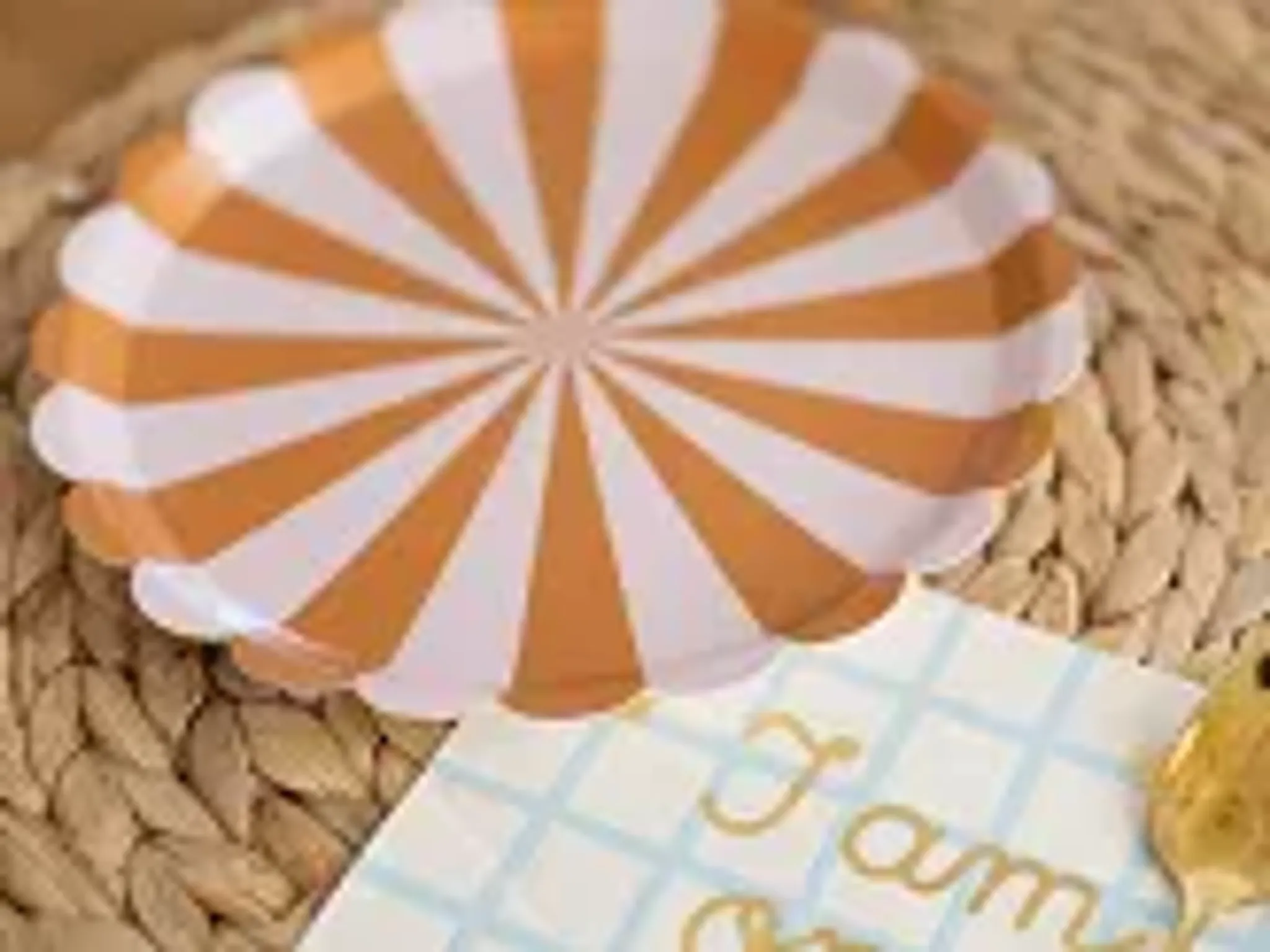 Dessa eleganta papptallrikar har ett stilrent mönster i varma bruna och mjuka rosa nyanser. Färgerna växlar harmoniskt och ger en festlig känsla som passar perfekt till babyshowers, födelsedagskalas, picknickar eller andra festliga tillfällen där du vill duka med något extra fint. Tallrikarna är tillverkade av papper och har en diameter på cirka 21 cm – lagom storlek för tårta, snacks eller mindre rätter. De kombinerar snygg design med bekvämlighet, och gör det enkelt att skapa en genomtänkt dukning utan disk.