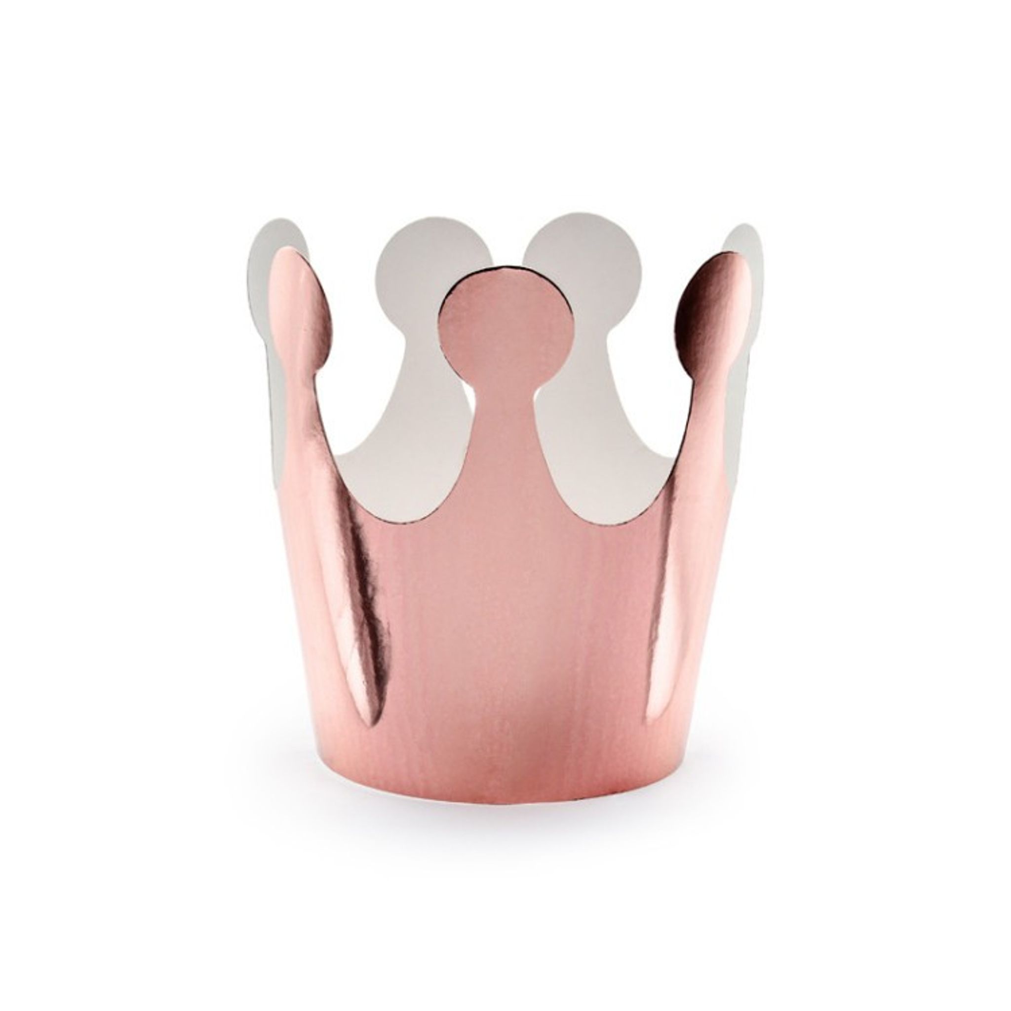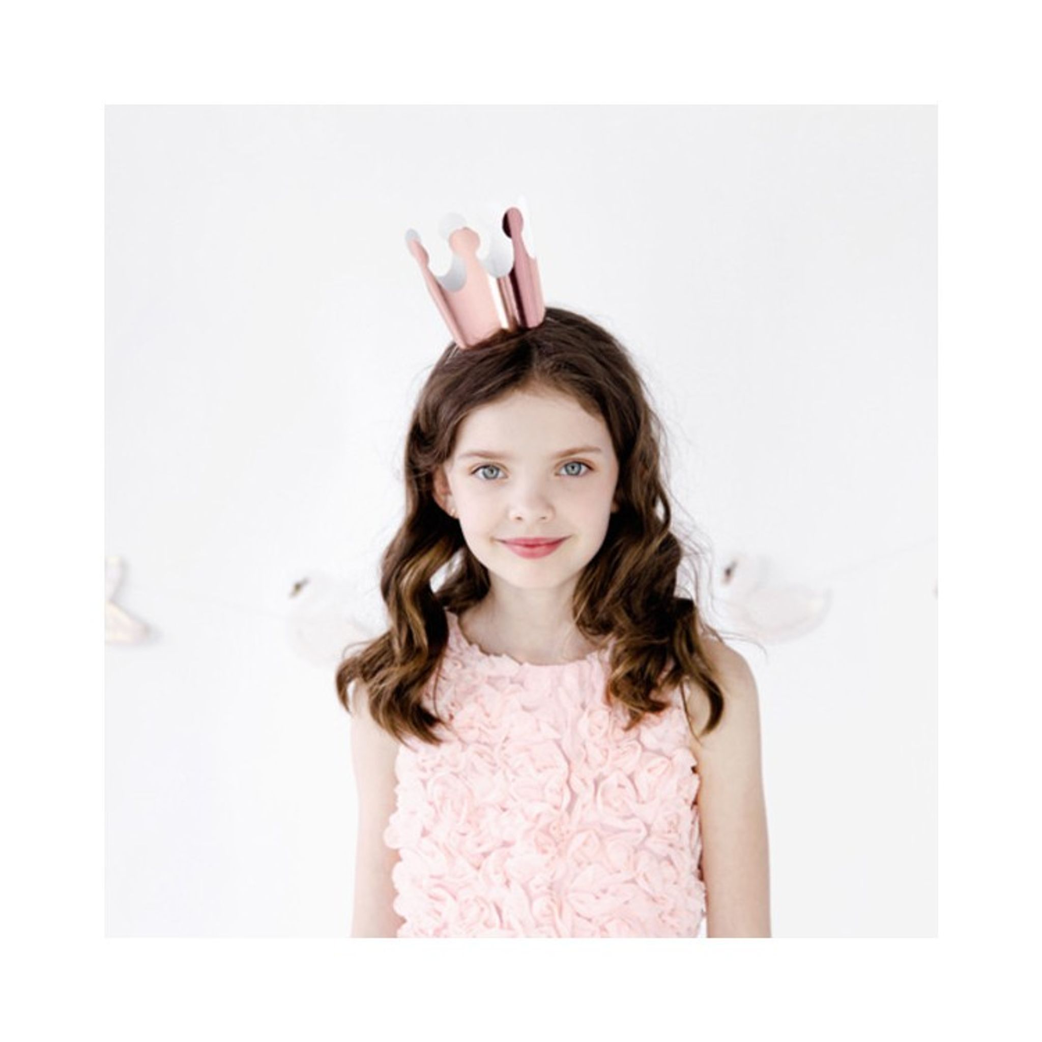 Papperskronan är gjord av kraftig roséguld färgat papper och kommer i platt förpackning. Kronan har ett gummiband som du fäster under hakan.