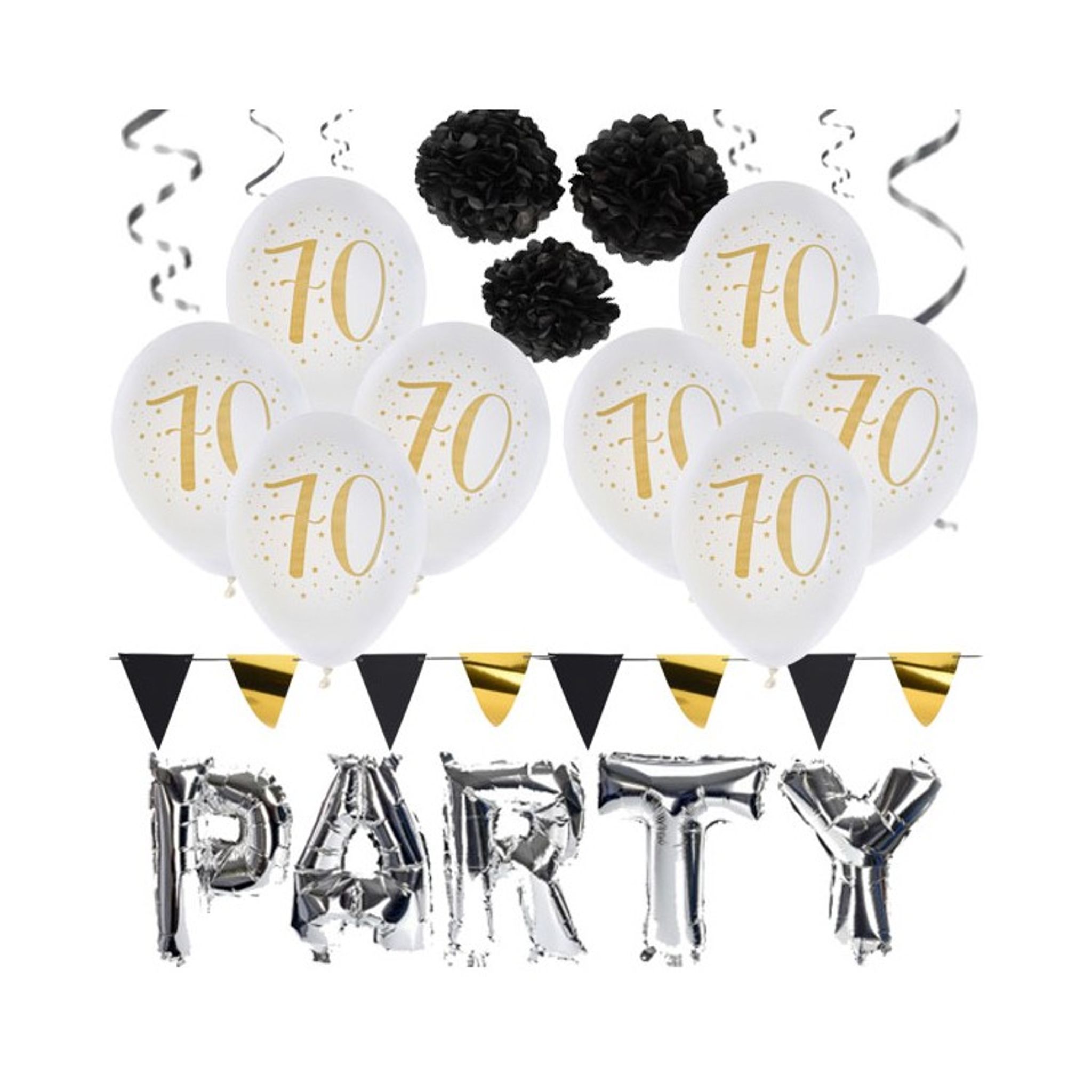 Dekorera för firandet med det här läckra kitet i guld, vitt, silver och svart. En snygg kombo som passar utmärkt till våra dukningsartiklar till 70-års temafesten.