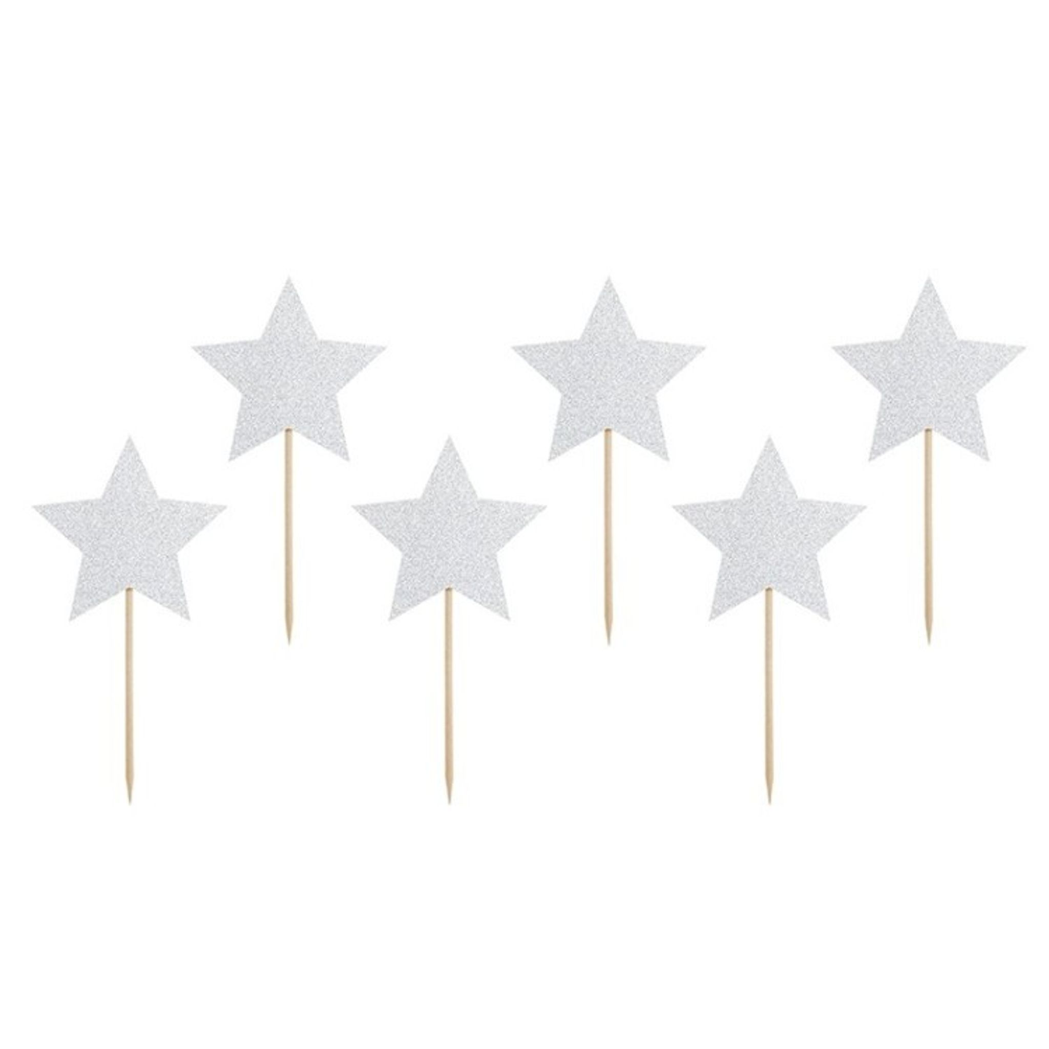 6 st fina glittriga stjärnor på tandpetare för dekoration av bakverk med mera. Dekorera enkelt och snyggt till alla typer av kalas, fest och party med dessa partypicks. Höjd 11,5 cm