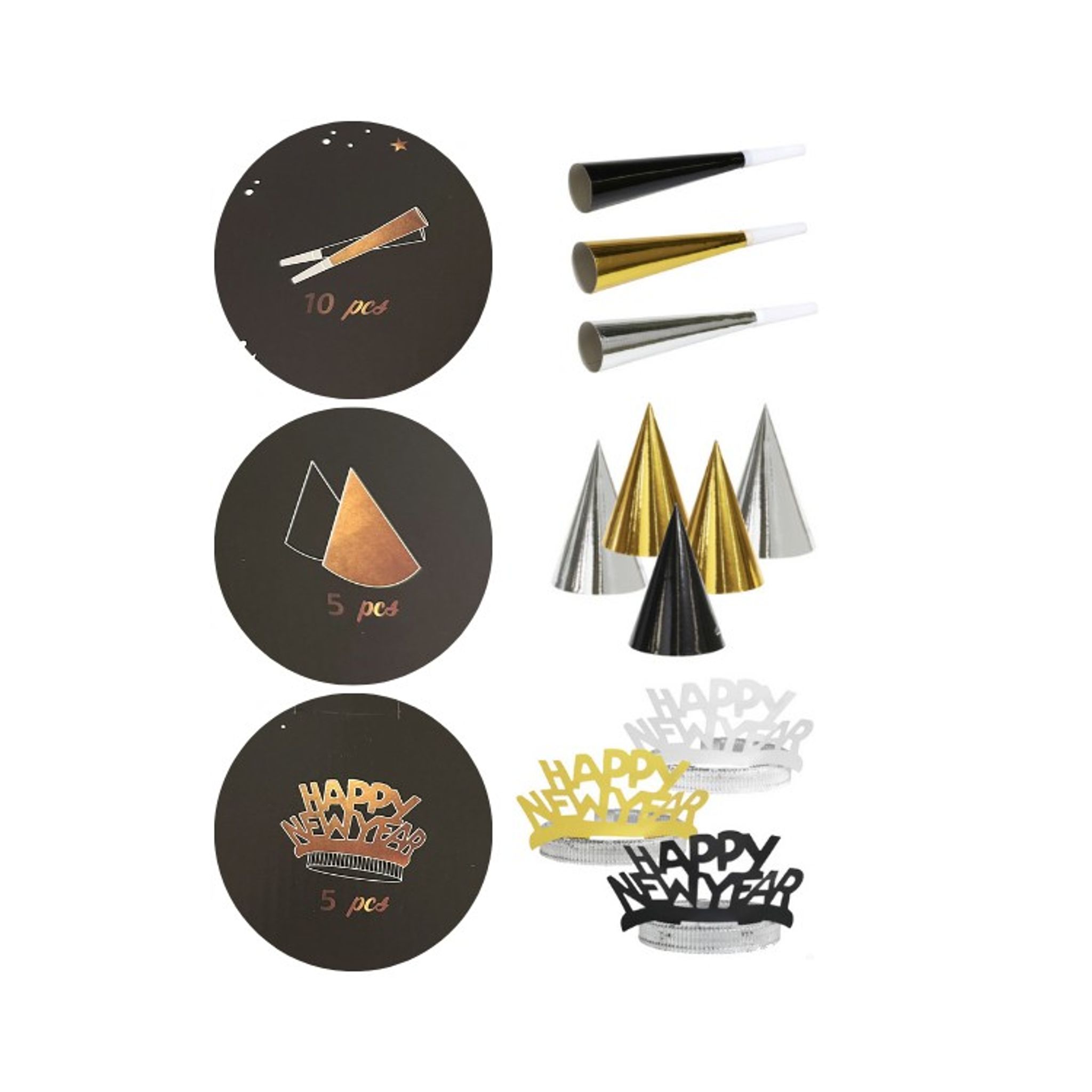 Utsmyckningar och tutor hör Nyår till, ellerhur? Vad passar bättre än ett färdigt partyset med hattar, kronor och tutor för alla dina gäster! Kombinera med andra dekorationer och dukningsartiklar i guld, svart och silver för ett enastående firande!