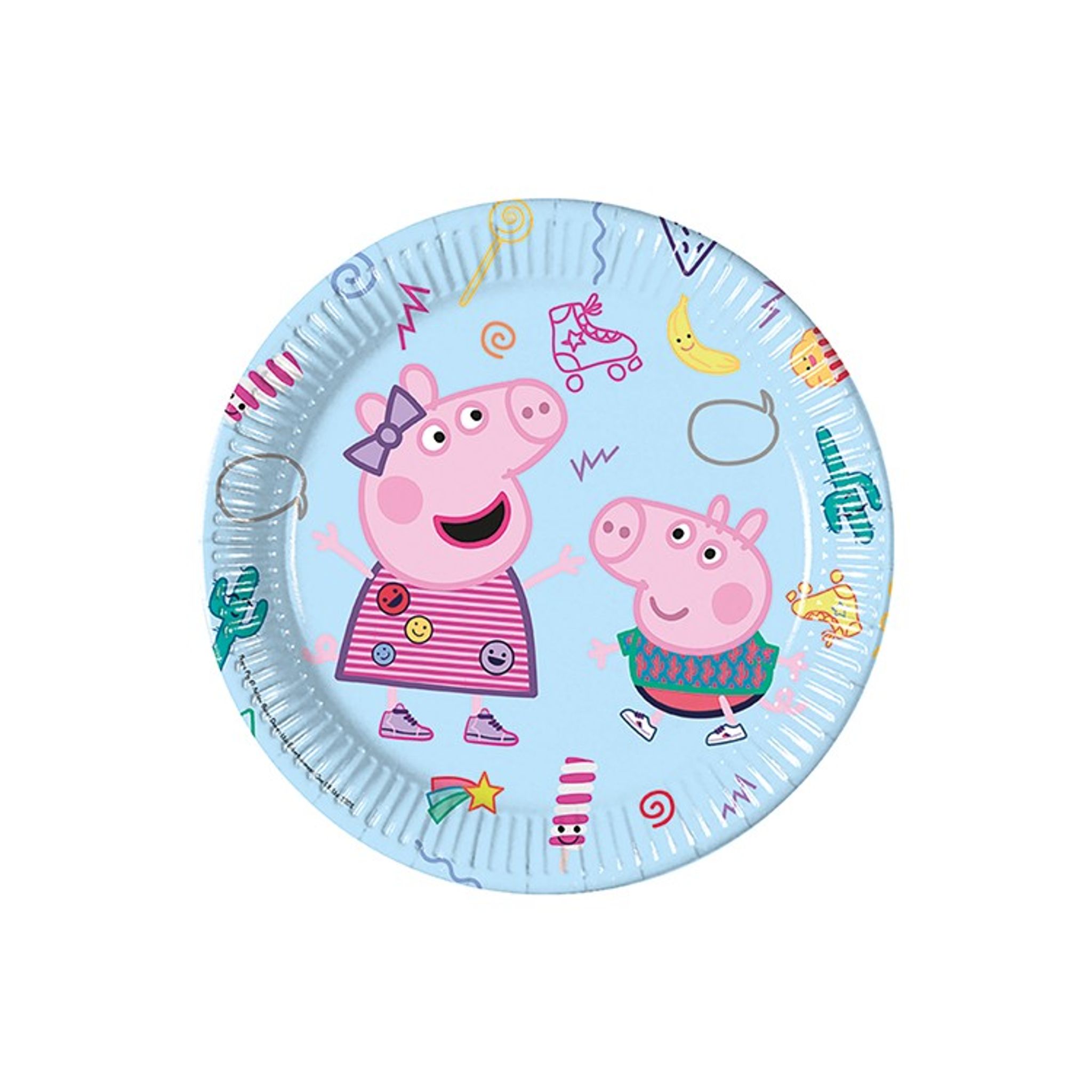 En förpackning innehåller 8 stycken papperstallrikar med måttet 23 cm i diametern. Tallrikarna pryds av Greta och hennes lillebror Georg som båda två har en riktig partystämning.