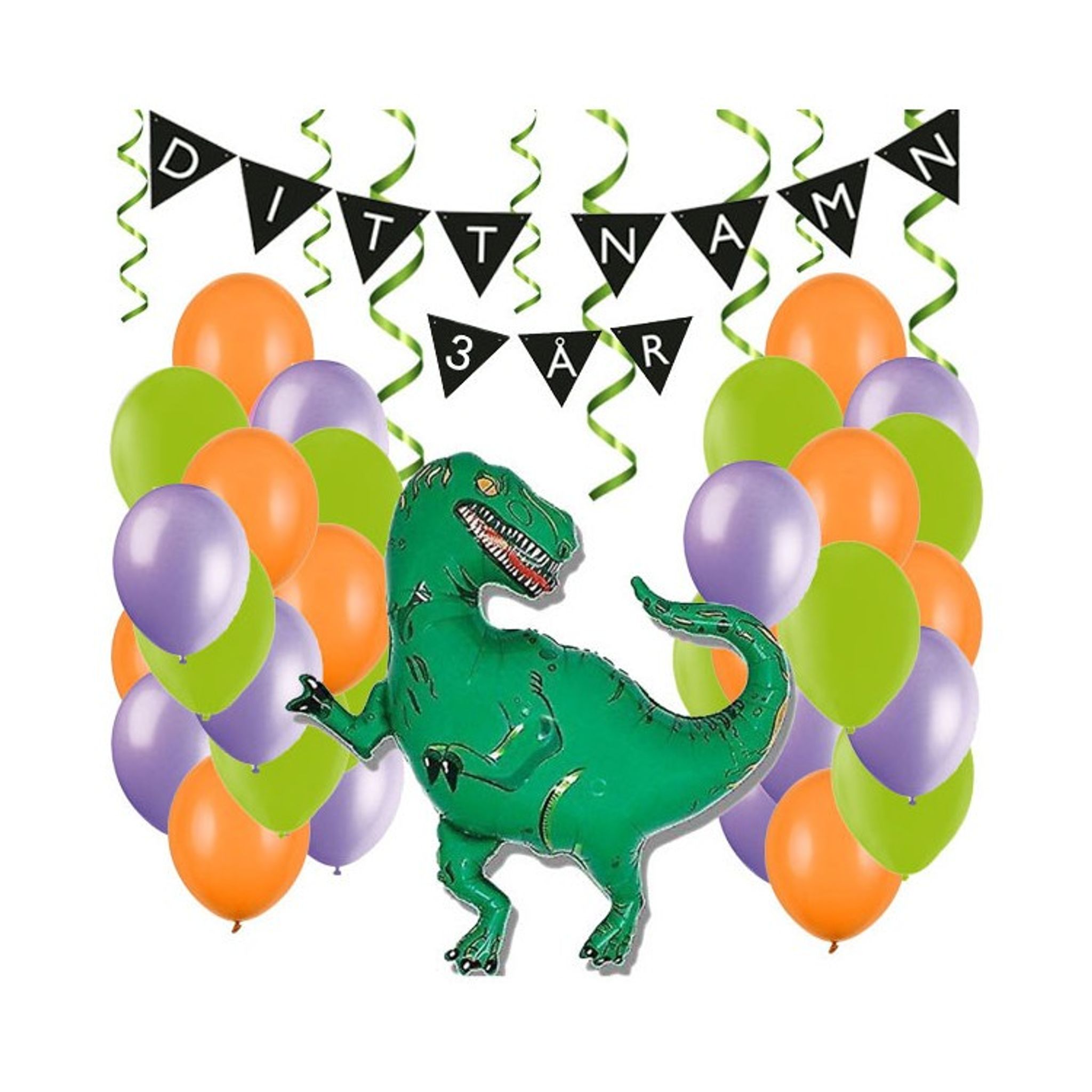Dekorationskit med folieballong, latexballonger, serpentiner och DIY vimpel. Passar utmärkt till kalaset med tema dinosaurier!
