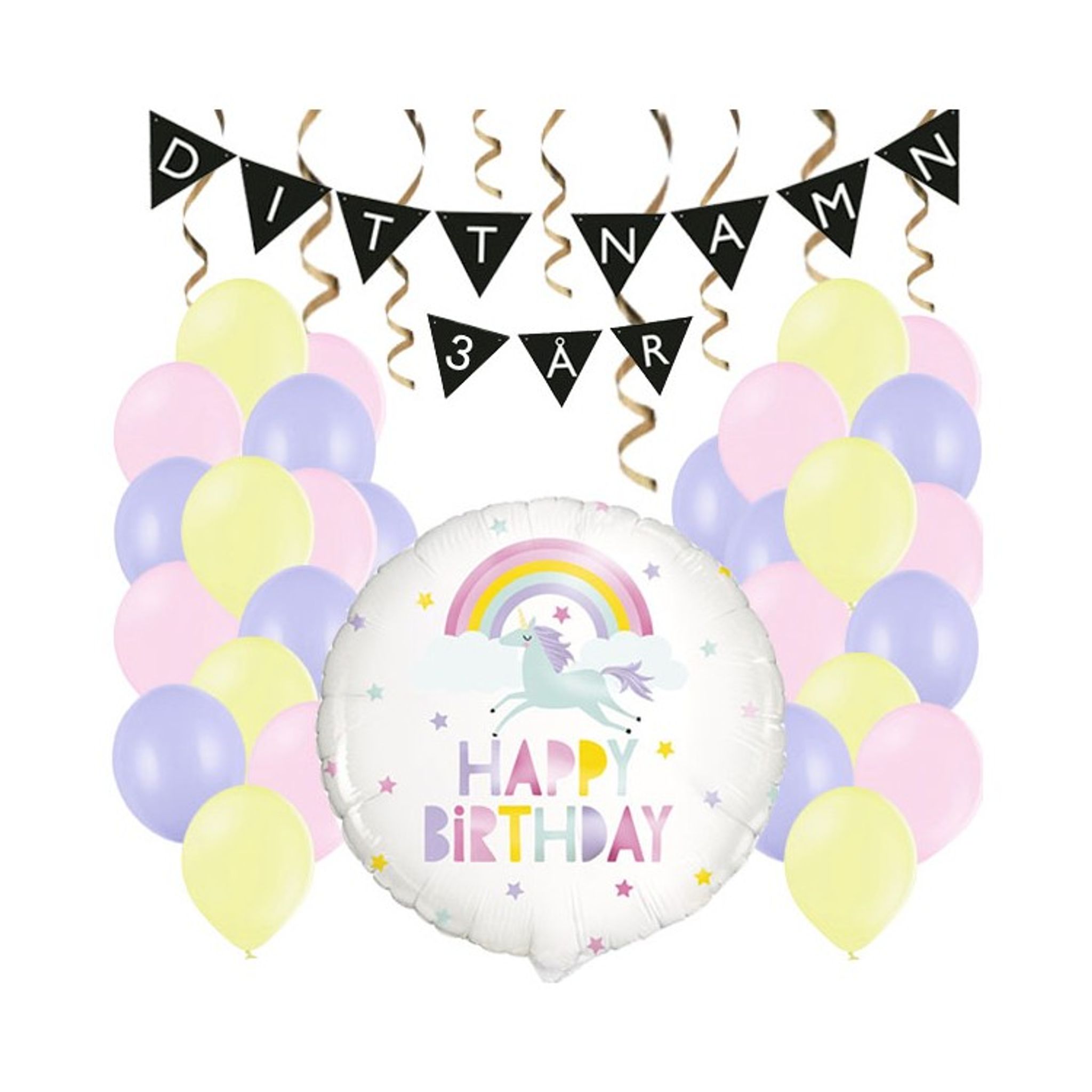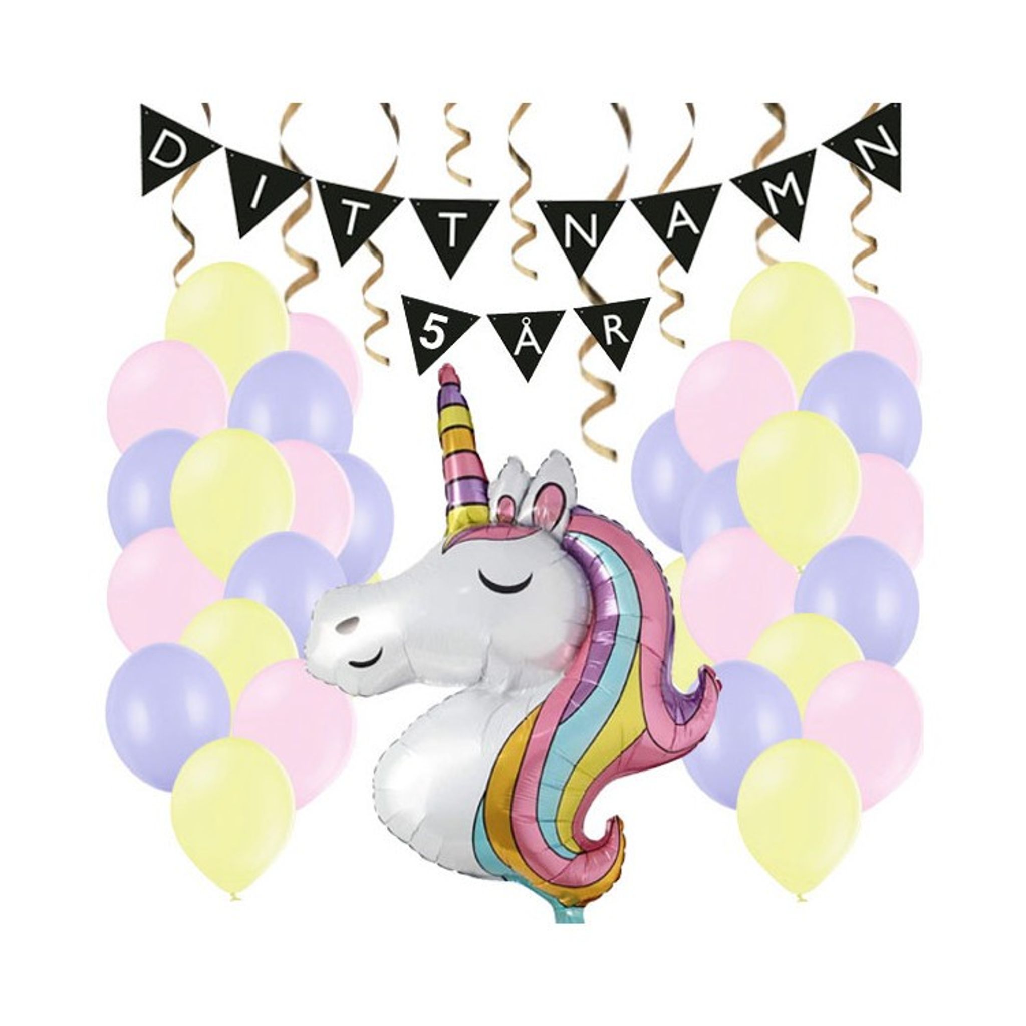 Dekorera enhörningskalaset med vackra dekorationer. Det här färdiga kitet med ballonger, folieballong, bokstavsvimpel och serpentiner gör kalaset extra festligt. Vimpeln anpassar du efter exempelvis barnets namn och ålder.