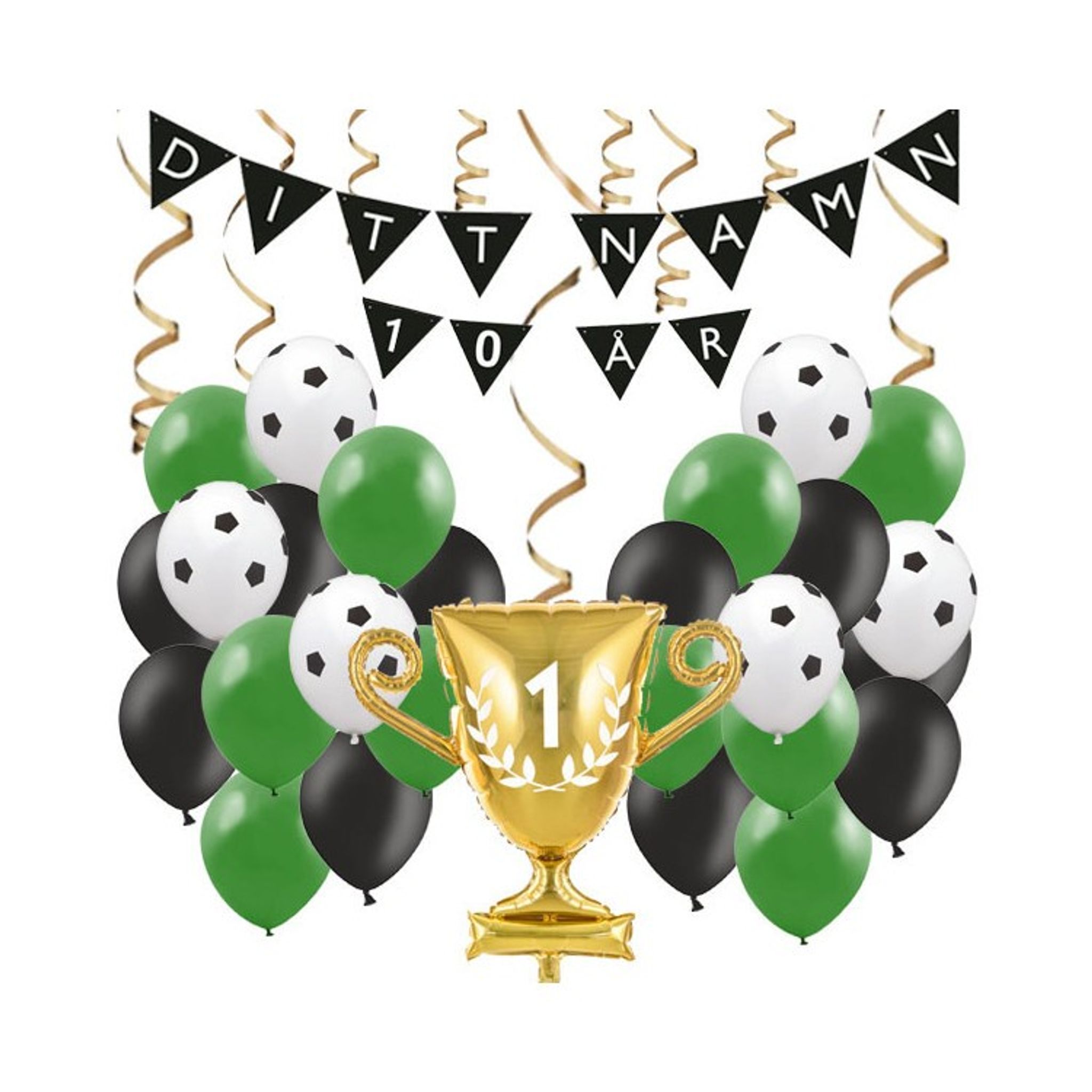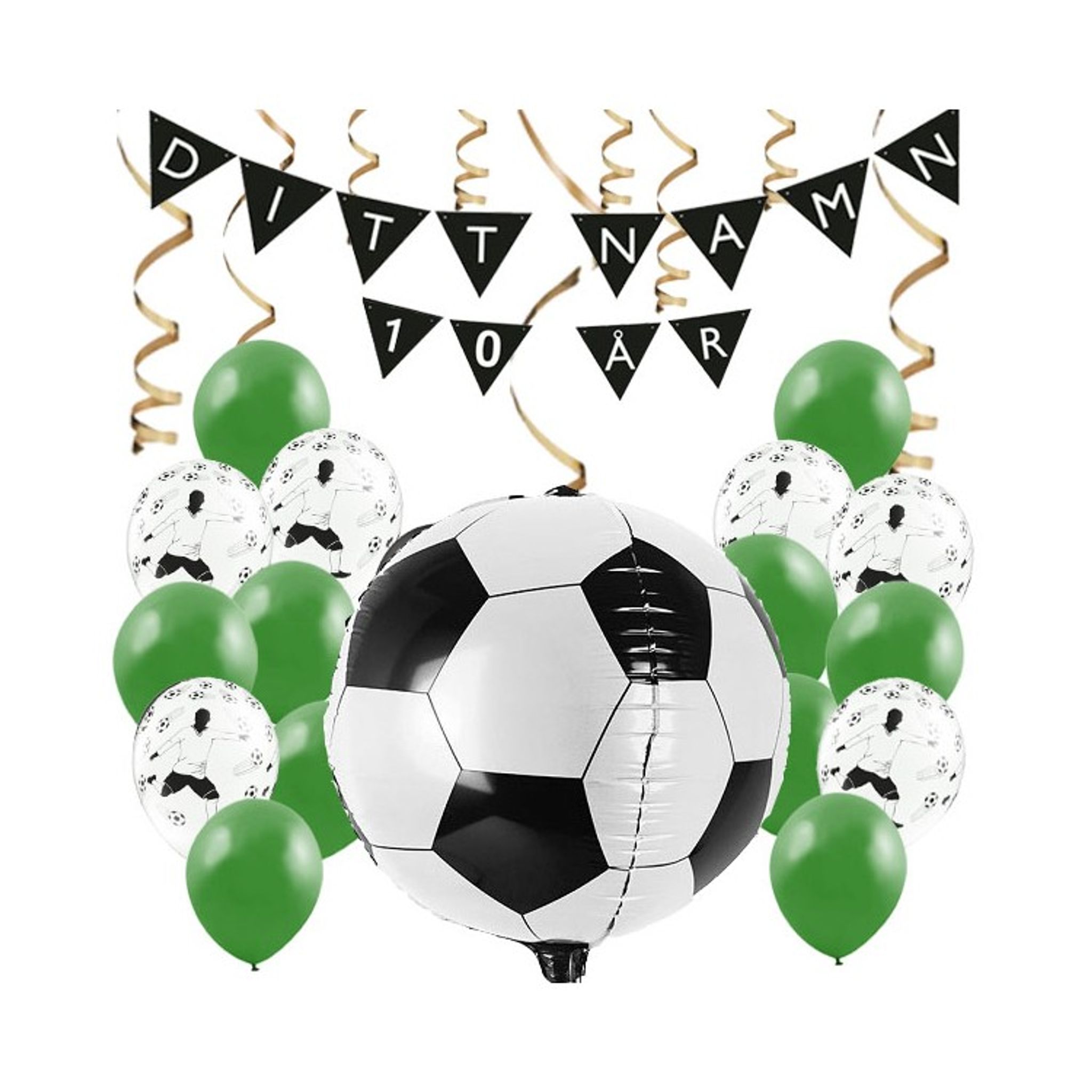 För barnet som inte får nog av fotboll är detta dekorationskit utmärkt på födelsedagskalaset. Vimpeln kommer med bokstäver och siffror så du själv kan skapa en vimpel som passar födelsedagsbarnet. Tillsammans med ballonger och serpentiner har du festliga dekorationer som sätter stämningen.