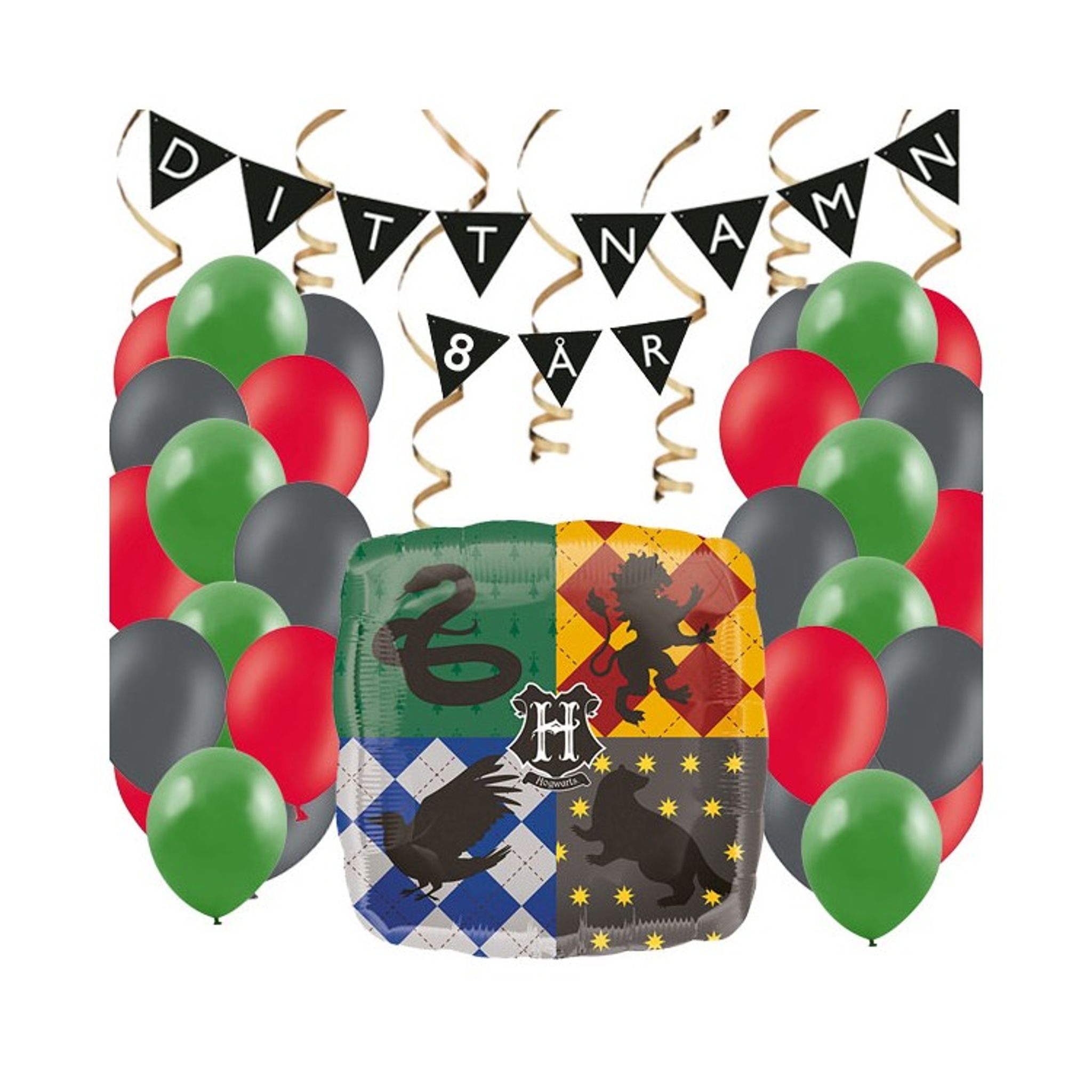 Vi har plockat ihop ett dekorationskit med detaljer som matchar och blir extra snyggt till Harry Potter kalaset. Kombinera med andra detaljer ur samma tema för ett extra magiskt firande! Vimpeln skapar du själv efter exempelvis barnets namn och detta gör att kalaset blir personligt för den som fyller år.