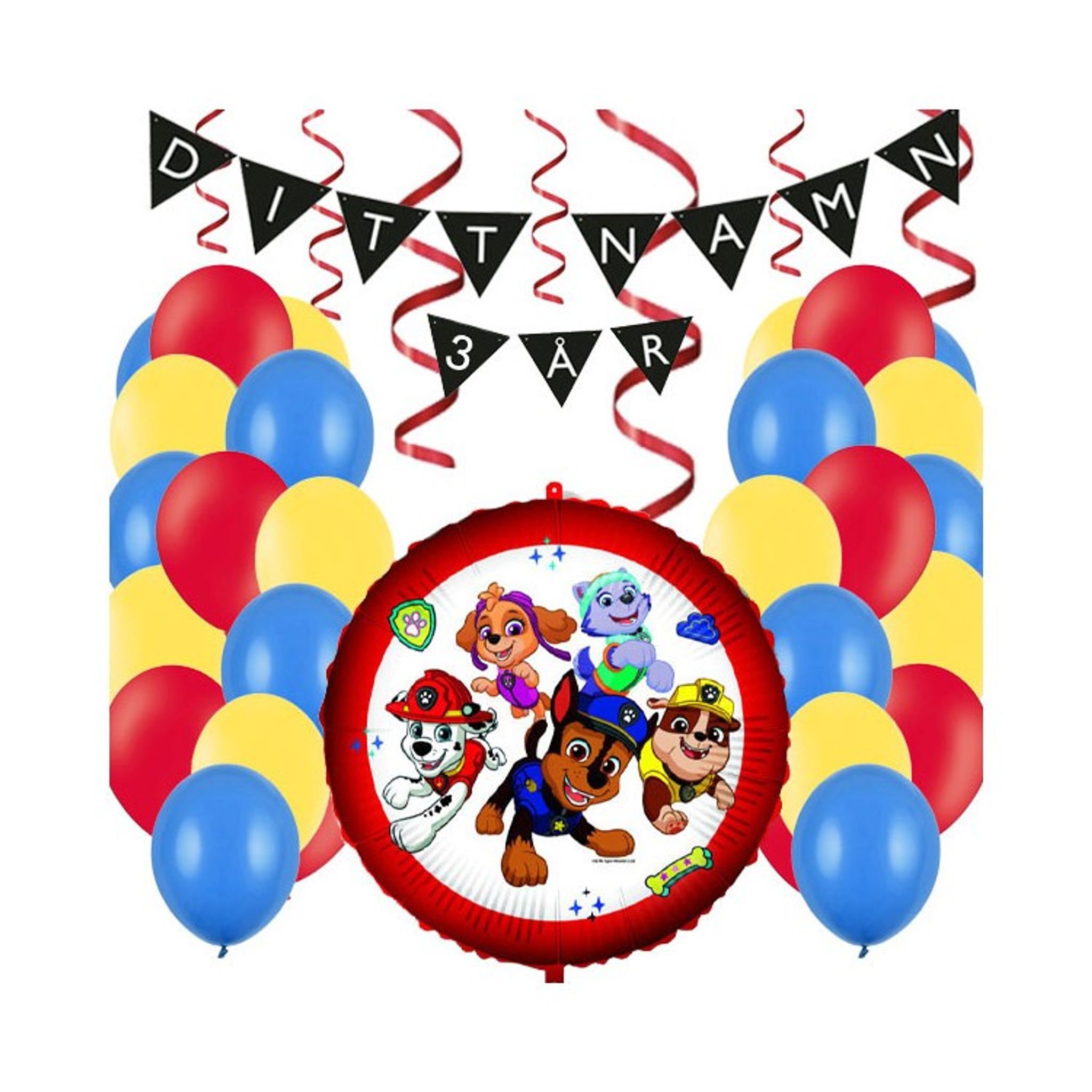 Färdigt paketpris med dekorationer till Paw patrol kalaset. Innehåller bland annat en DIY vimpel som du kan anpassa efter exempelvis barnets namn och ålder.