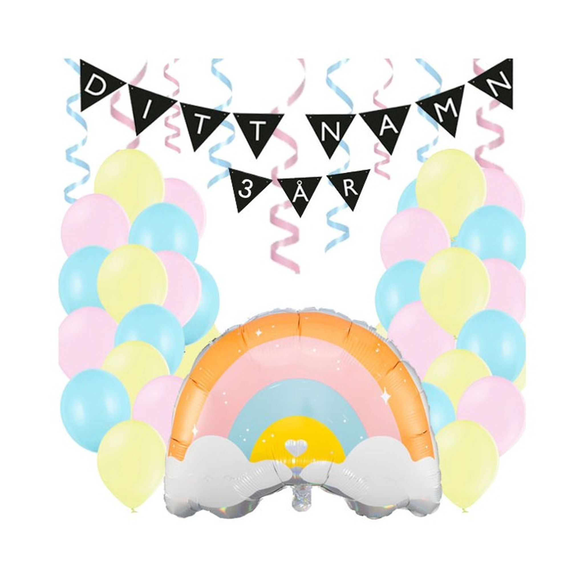 Dekorationskit i pastellfärger till Regnbågskalas.