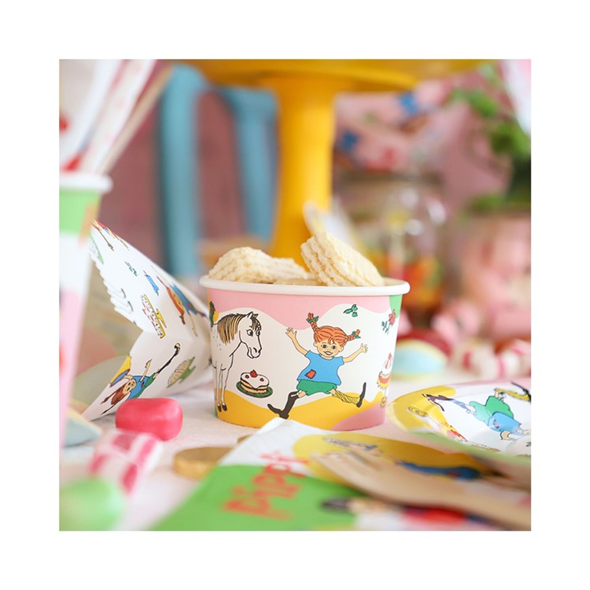 Glass i stora lass! Med dessa fina bägare med Pippi motiv kan du bjuda på glass, kakor eller snacks till kalasgästerna.