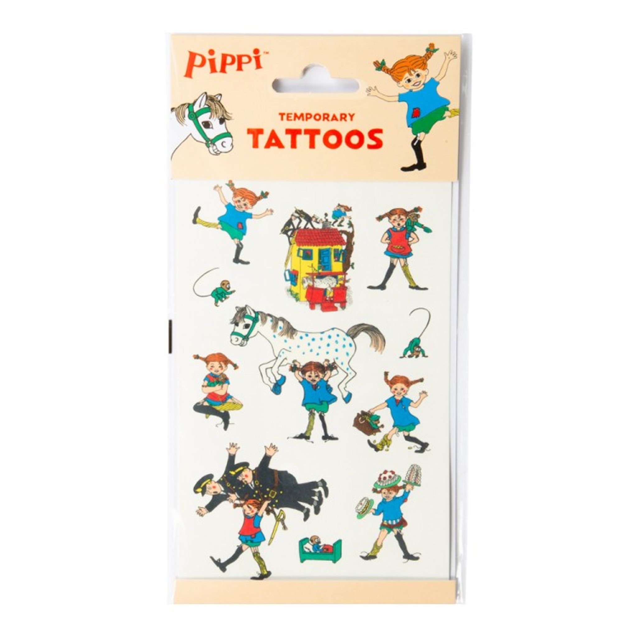 Engångstatueringar med fina Pippi motiv. Ge bort som present, Tatuera gästerna med en fin temporär tatuering som fästs på huden med hjälp av vatten, Eller klipp ut motiven och lägg i kalaspåsarna till fiskdammen så att alla barn får en liten souvenir med sig hem från kalaset.