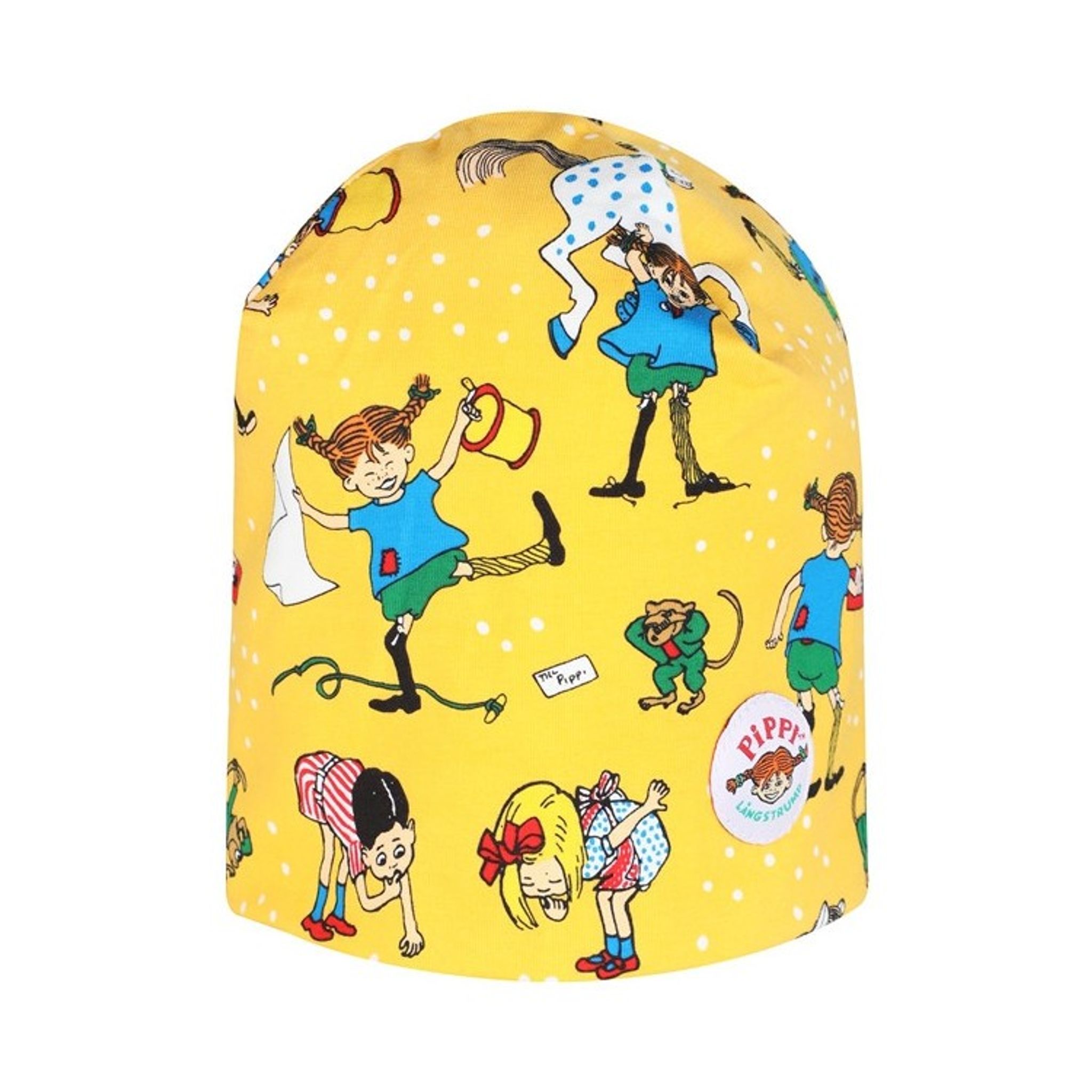 Fin mössa i härlig Pippi-gul färg med motiv av Pippi Långstrump och hennes vänner. Mössan är tillverkad i dubbelsydd trikå och har även små söta vita prickar som Pippi och hennes vänner tycker är mycket intressanta.
