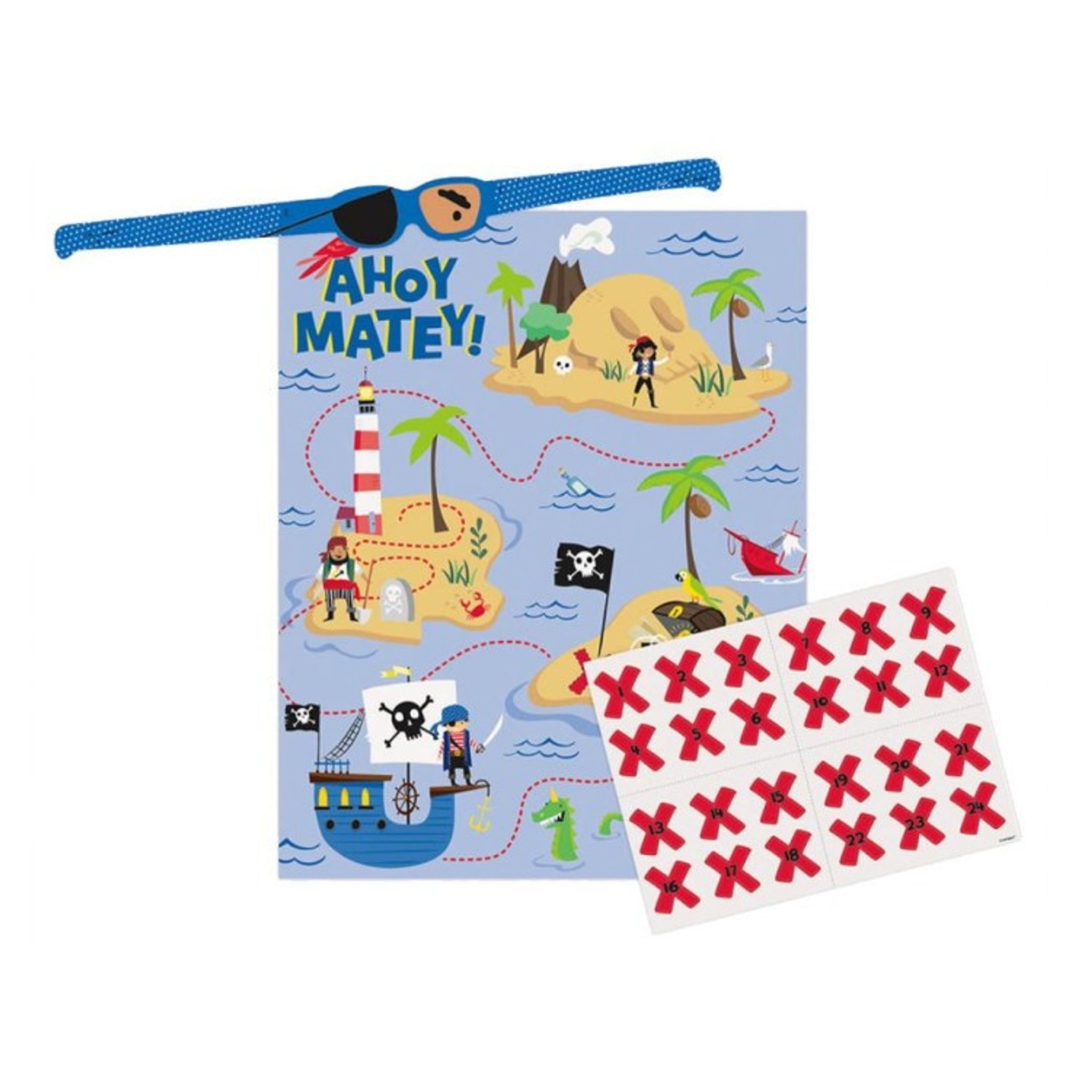 Väntar ni in ett helt gäng med små kalassugna pirater? Nu kan ni skapa ett födelsedagskalas de sent glömmer! Fäst spelbladet på en plan yta, exempelvis en dörr, där alla gäster når upp. Ge alla barn ett varsitt rött kryss med en siffra på och berätta spelets regler. Låt sedan en och en få på sig ögonbindeln, snurra runt och gå fram för att fästa krysset utan att se var. Den spelare som har hamnat närmast rätt plats vinner första pris!