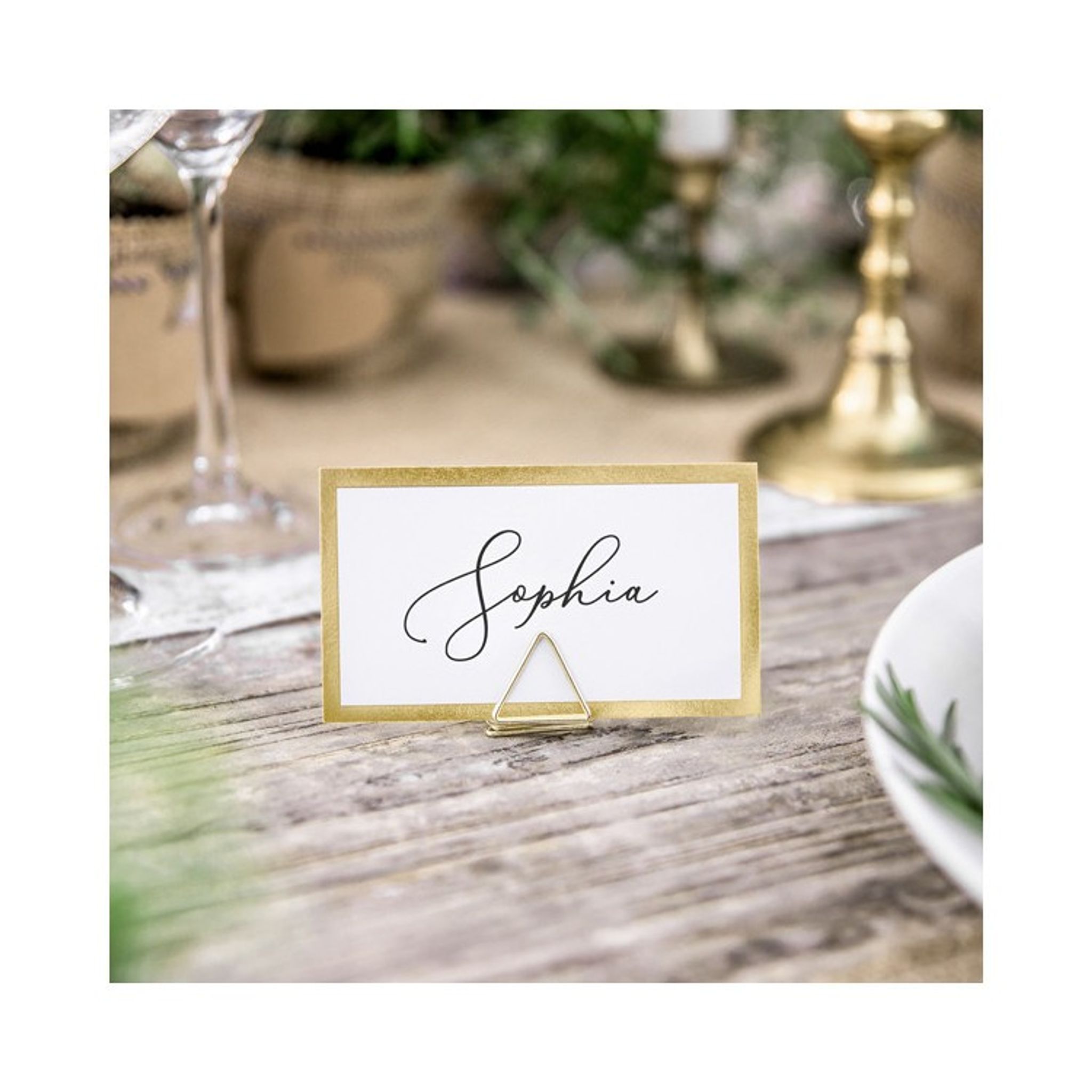 Placeringskortshållare Triangel 10-pack. Dekorera bordet med stil och se till att välkomna dina gäster med snygga placeringskort i dekorativa placeringskortshållare. Med den fint designade triangulära formen och guldiga färgen höjer du nivån på din dukning. Placeringskorten gör din bordsplacering mer personlig och dina gäster kommer känna sig extra välkomnade.